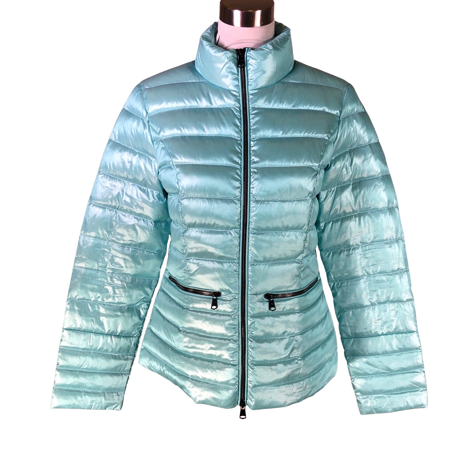 Väri: mintun vihreä. Tuotteen pinta on kiiltävä. Korkea kaulus. Tuotteessa on kaksisuuntainen vetoketju. Konepesu sallittu. Tuotteen pinnassa on muutama tahra. Tuote on muilta osin uudenveroisessa kunnossa.