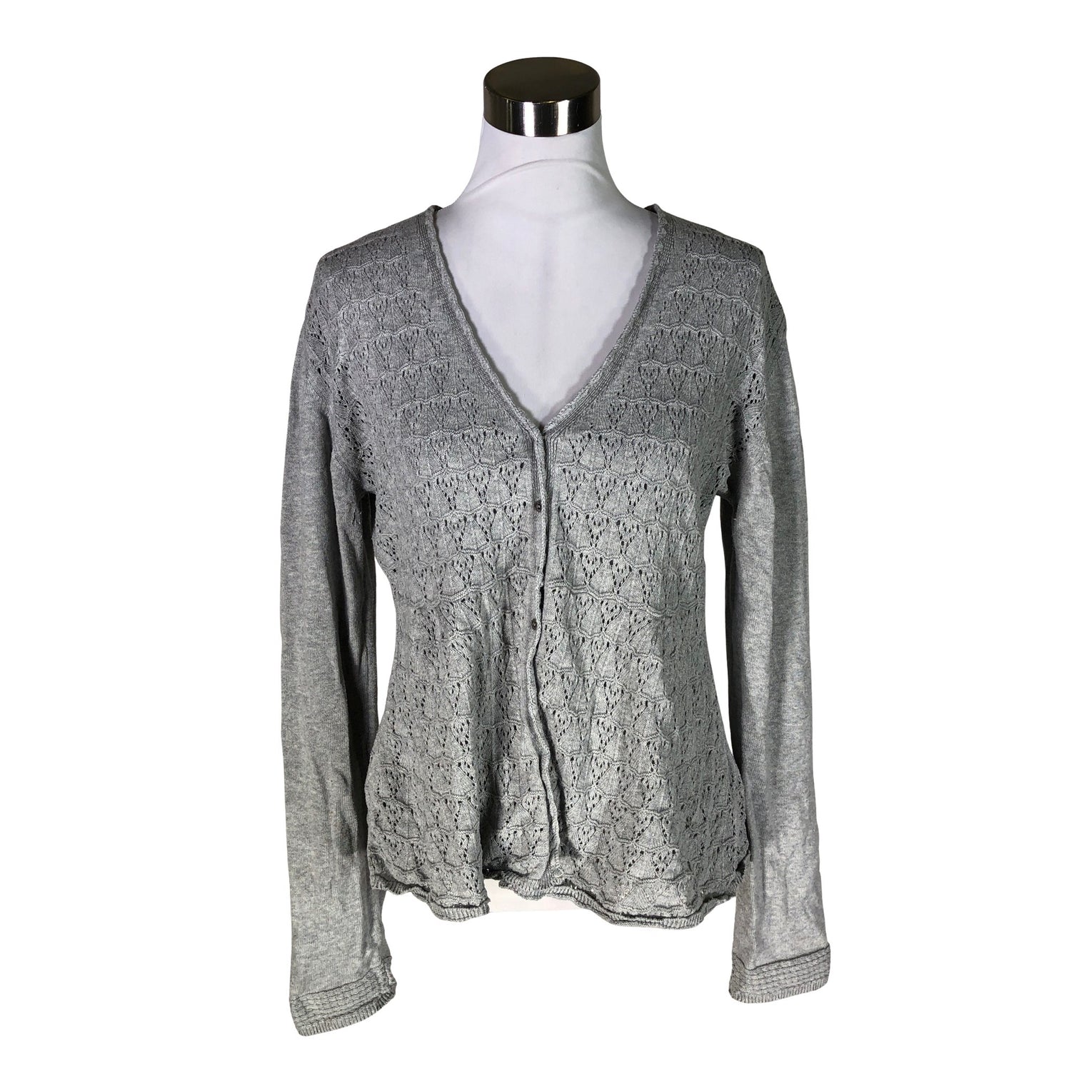 Pitsineulosta. Ohutta neulosta. Materiaali joustaa. Tuotteen pinnassa on hieman pesu-/käyttökulumaa. Yleisilme on siisti.