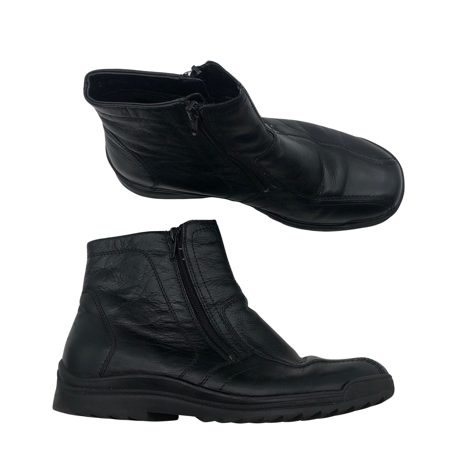 Nahkaa. Karvavuori. Sivusaumoissa on vetoketjut. Kengässä on leveä lesti. Kenkien kärjissä on hieman kulumaa. Tuote on muilta osin hyvässä kunnossa.