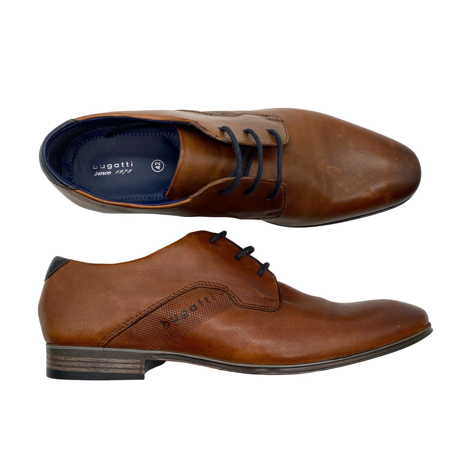 Bugatti Juhlakengät, koko 42. Nahkaa. Tuotteen pinnassa on aavistus tummentumaa. Tuotteen sisäpuolella on aavistus tummentumaa. Tuote on muilta osin hyvässä kunnossa.