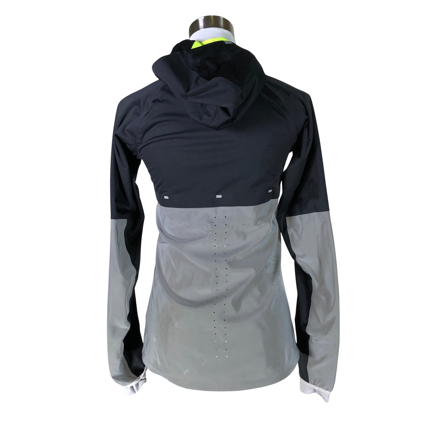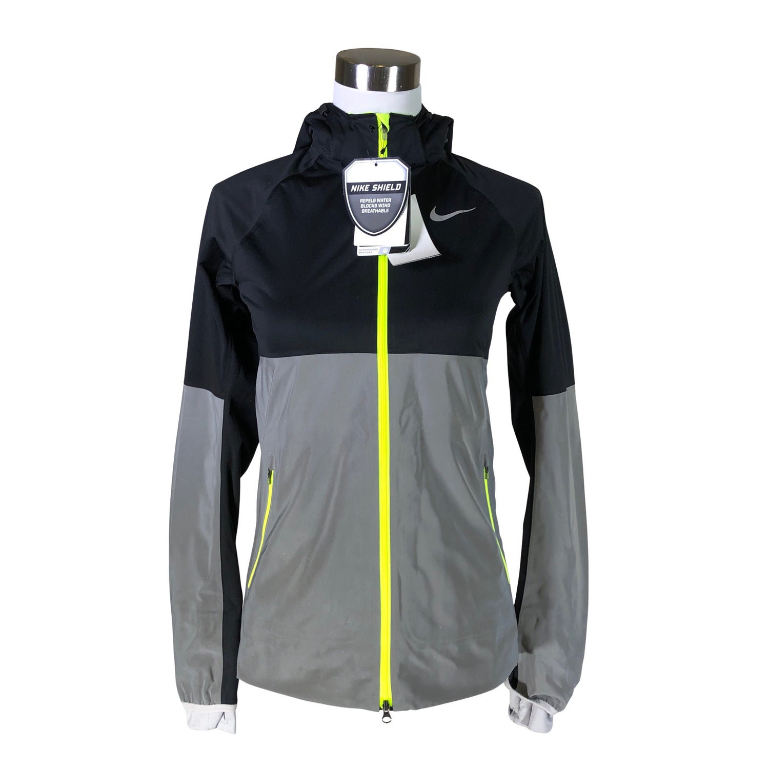 Sh# 350 $. Mallisto: Nike Shield. Breathable -merkintä. Tuotteessa on merkintä: repels water. Heijastava pinta. Tuotteessa on kiristysnyöri helmassa.