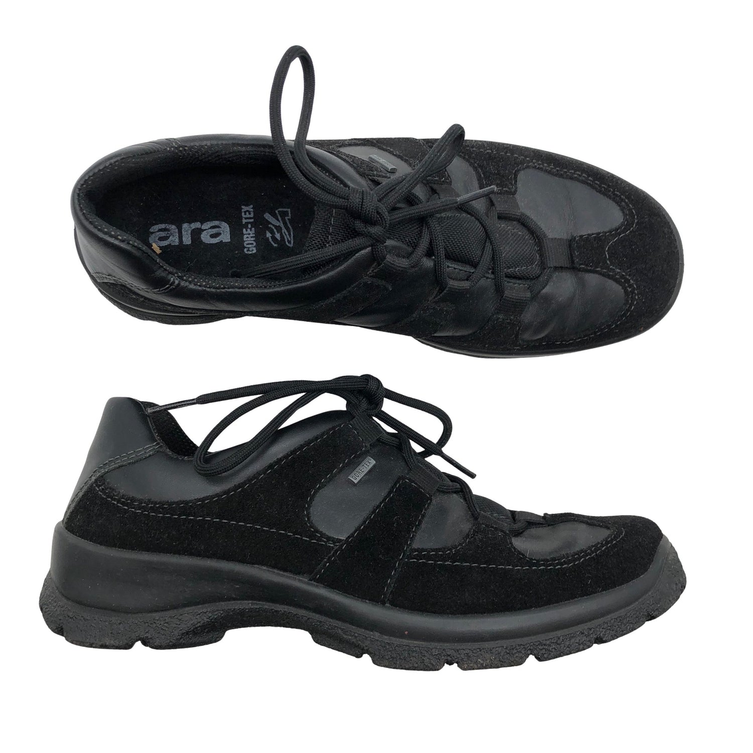 Ara Lenkkarit, koko 37. Materiaalitieto puuttuu. Todennäköisesti nahkaa. Mokkamainen pinta. Gore-Tex -merkintä. Tuotteen pinnassa on aavistus pesu-/käyttökulumaa. Yleisilme on siisti.
