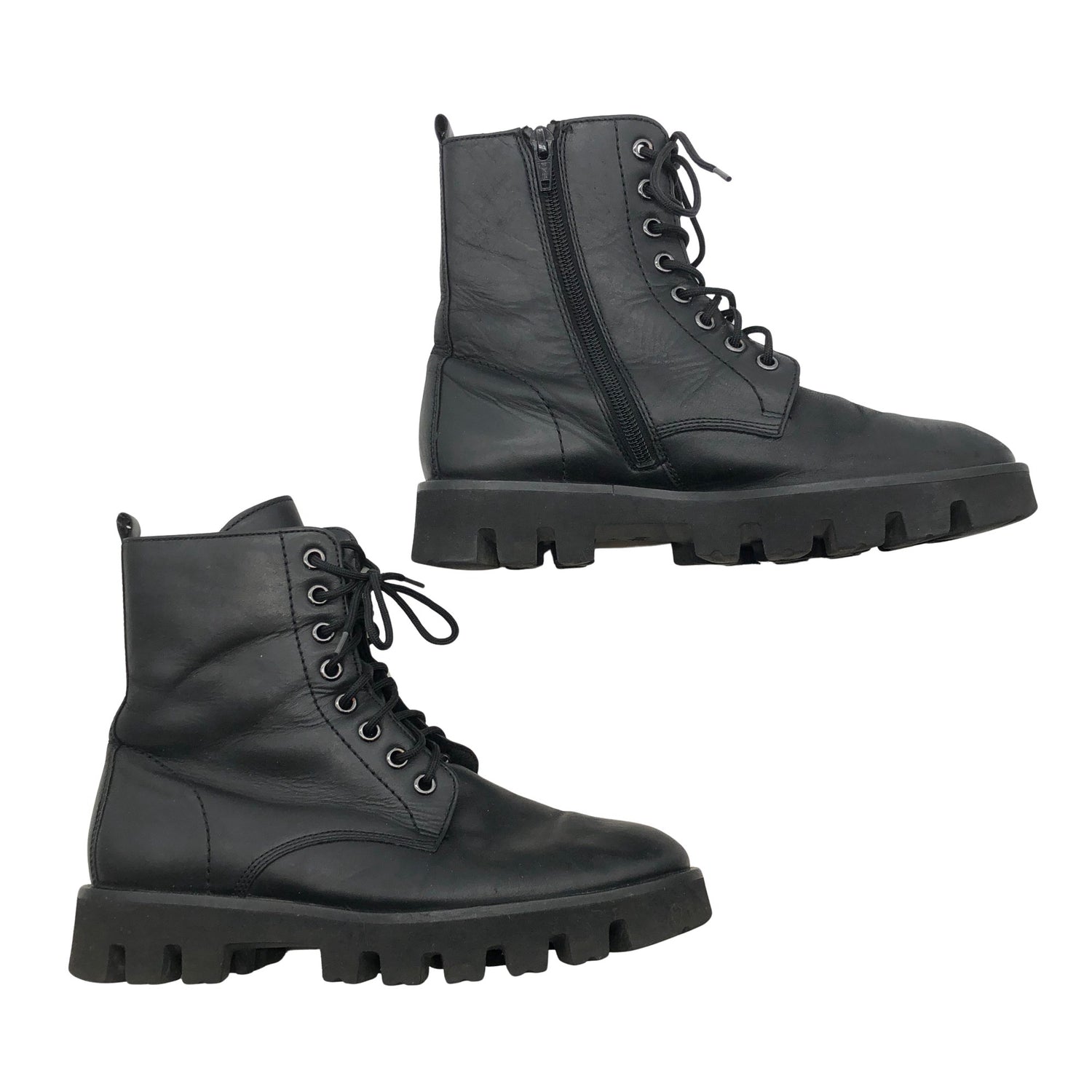 Materiaalitieto puuttuu. Todennäköisesti nahkaa. Sivusaumoissa on vetoketjut. Tuotteen pinnassa on hieman pesu-/käyttökulumaa. Tuote on muilta osin hyvässä kunnossa.