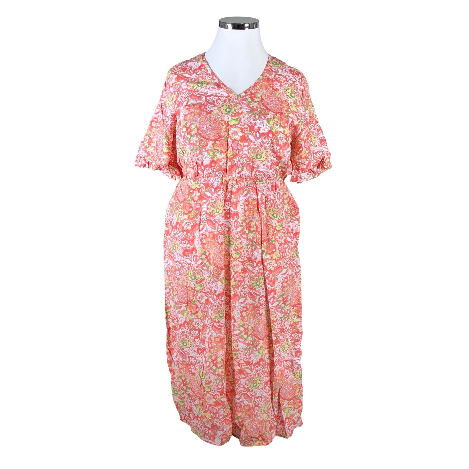 Laskeutuvaa materiaalia. Väri: koralli. Vaatteessa on taskut. Tuotteen pinnassa on aavistus pesu-/käyttökulumaa. Yleisilme on siisti.