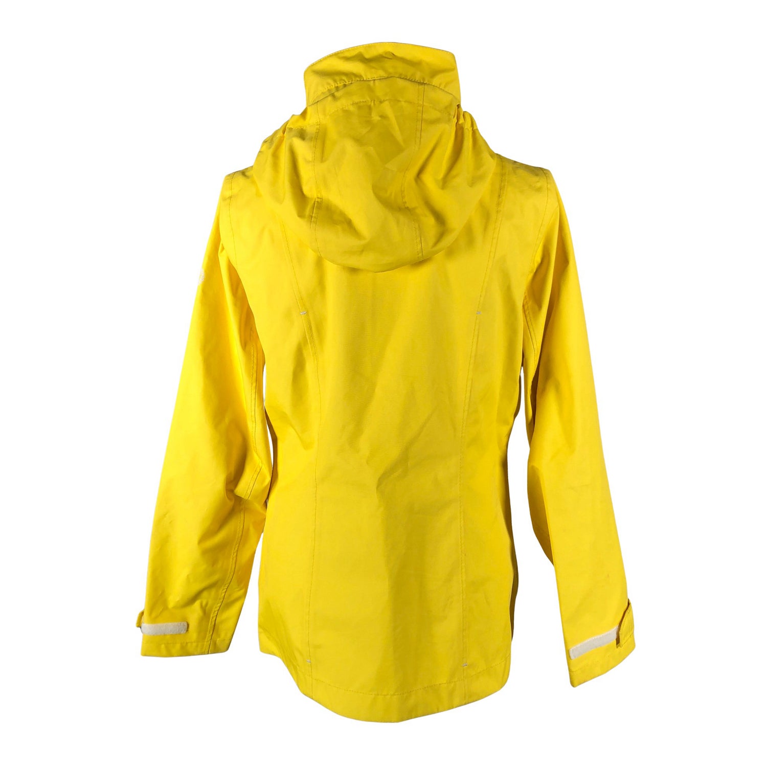 Kuoritakki. Tuotteessa ei ole vuorta. Teipatut saumat. Materiaali ei jousta. Tuotteessa on piilotettava huppu. Kirkas väri. Tuotteen pinnassa on aavistus pesu-/käyttökulumaa. Tuotteen pinnassa on hieman tummentumaa. Yleisilme on siisti.