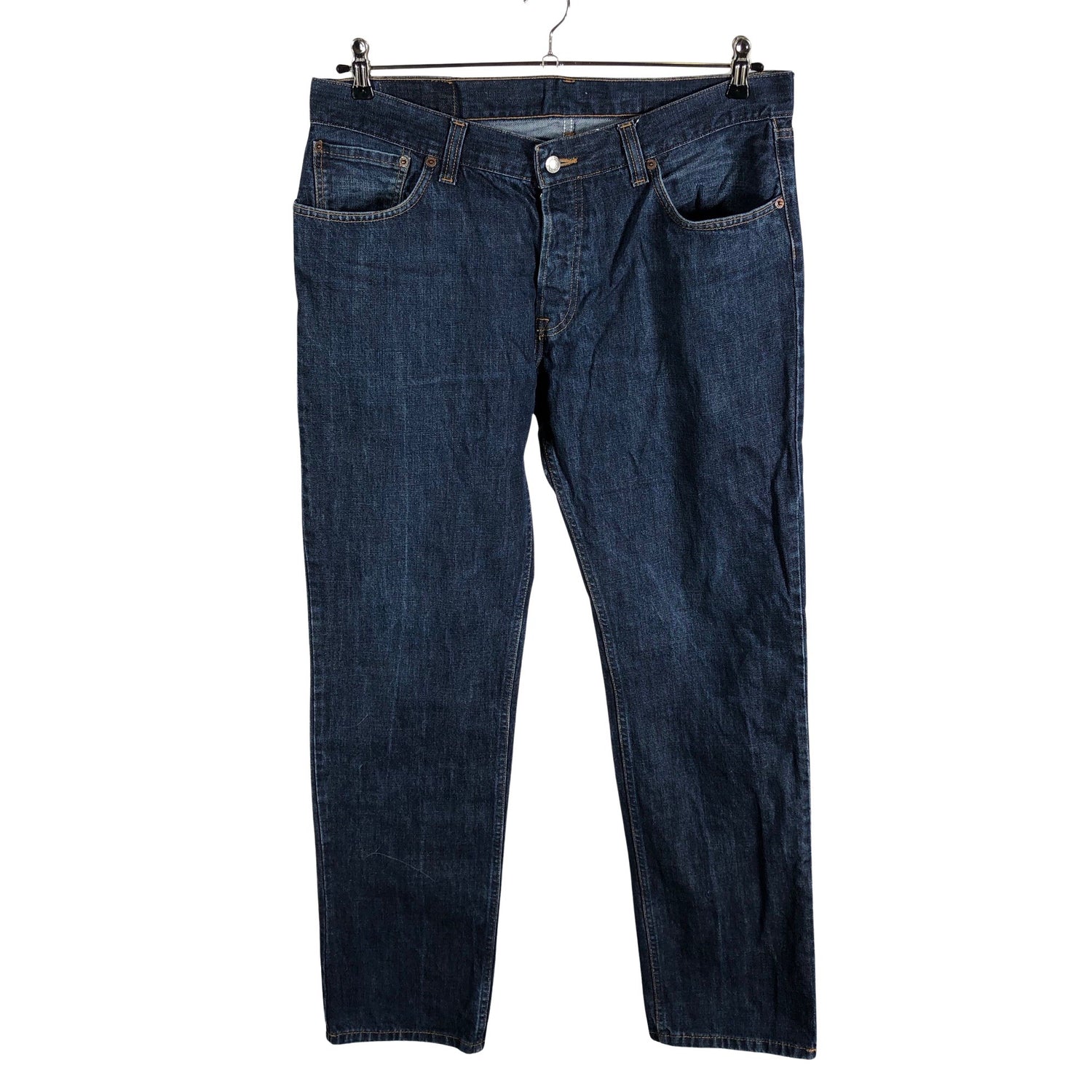 Malli: 501. Materiaali ei jousta. Tuotteen pinnassa on hieman pesu-/käyttökulumaa. Yleisilme on siisti.