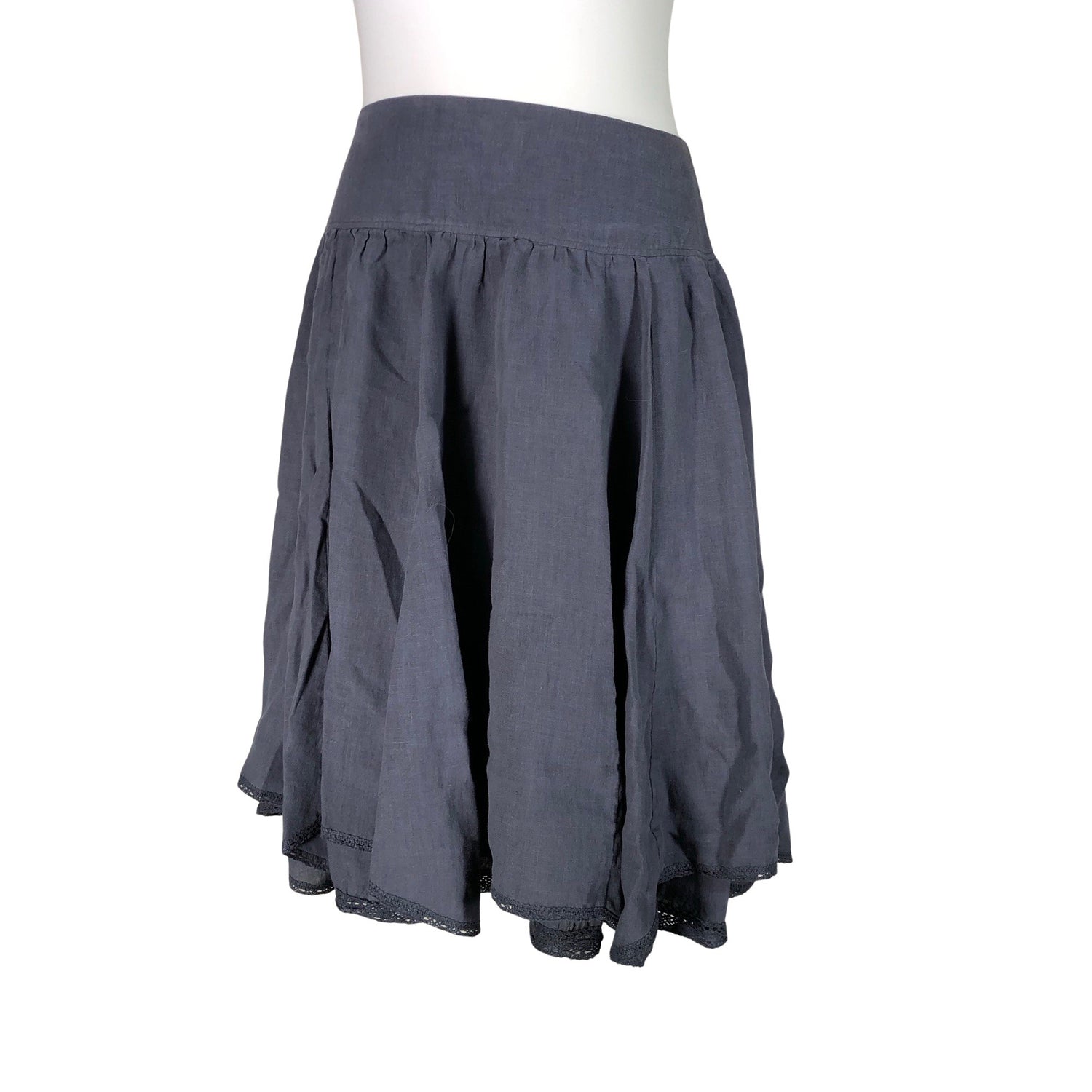 Materiaalitieto puuttuu, todennäköisesti pellavaa/pellavasekoitetta. Vetoketju takana. Materiaali ei jousta.