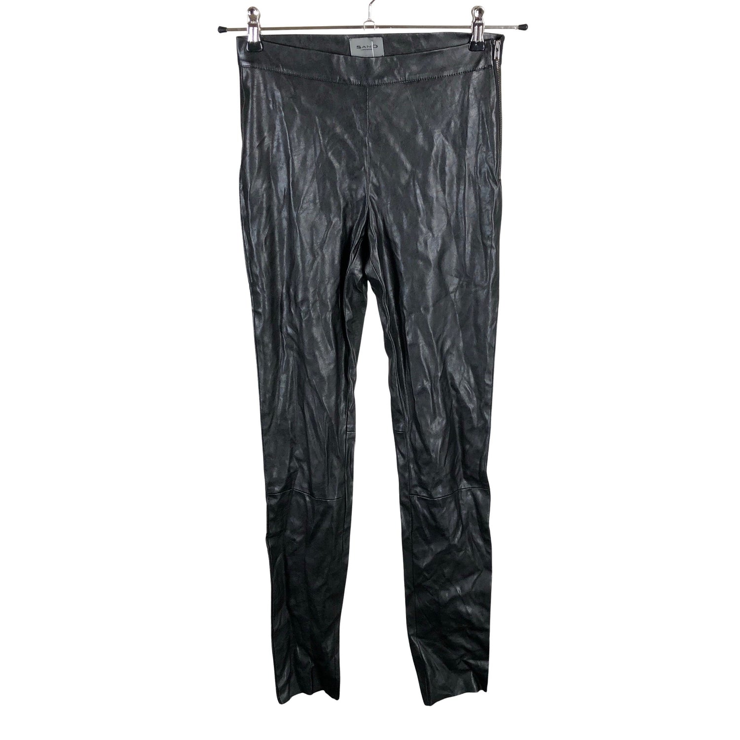 Keinonahkaa. Sivusaumassa on vetoketju. Materiaali joustaa hieman. Kapeat lahkeet. Tuotteessa on viimeistelemättömät reunat. Budjettilöytö. Tuotteen sauma on hieman auennut, ei vaikuta käyttöön. Katso lisäkuvat. Tuotteen pinnassa on aavistus pesu-/käyttökulumaa. Yleisilme on siisti.