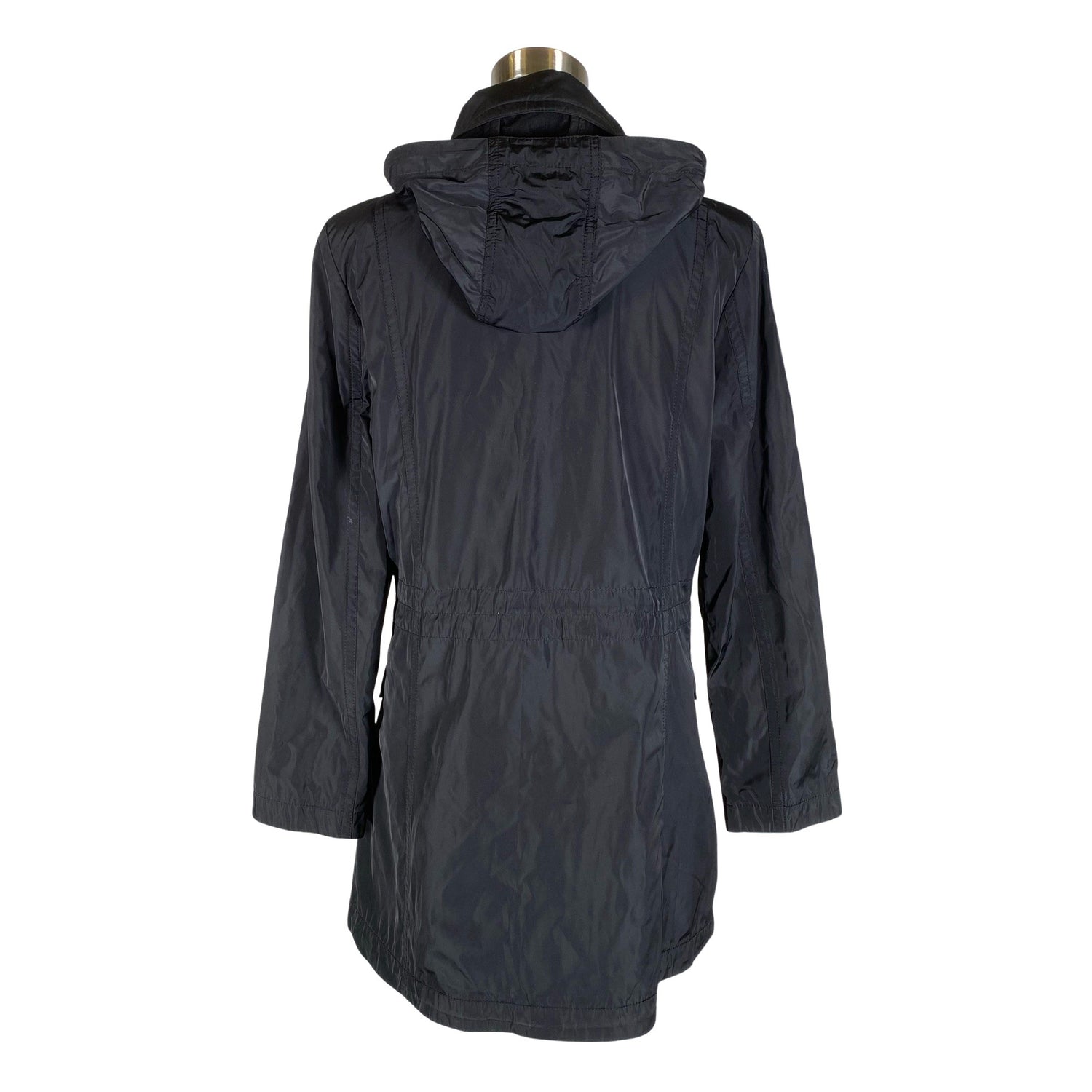 Kiristysnauha vyötäröllä. Tuotteessa on ohut vuori. Irrotettava huppu. Kauluksessa on hieman kulumaa. Tuote on muilta osin hyvässä kunnossa.