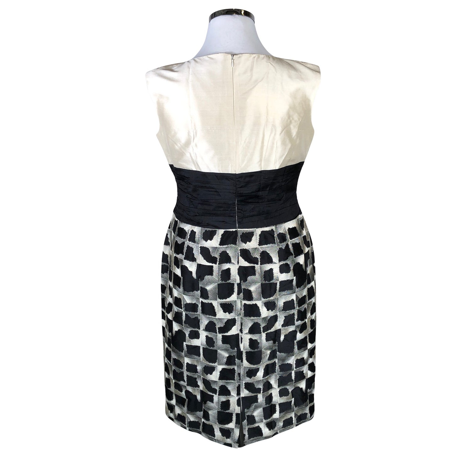 Tyköistuva malli. Silkkiä. Tuotteen pinta on kiiltävä. Vetoketju takana. Materiaali ei jousta. Kemiallinen pesu.