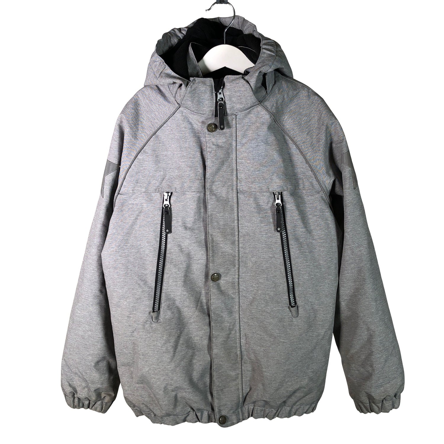 Irrotettava huppu. Fleecevuori. Tuotteen pinnassa on hieman tummentumaa. Hihan- ja/tai lahkeensuissa on hieman tummentumaa. Ripustuslenkki on poikki/irronnut. Tuotteen pinnassa on muutama tahra. Tuote vaatii pesun. Yleisilme on siisti.