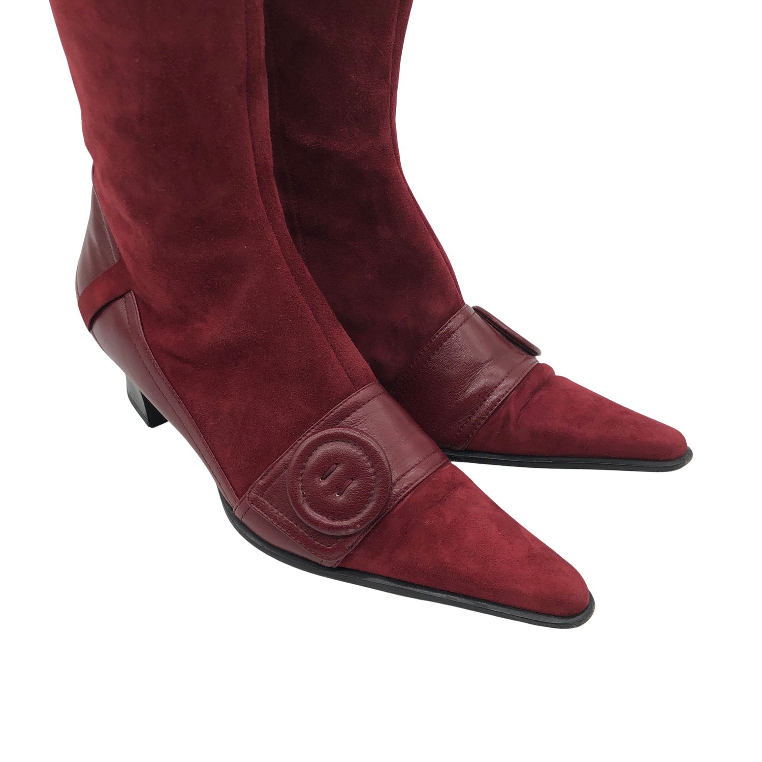 Materiaalitieto puuttuu. Todennäköisesti nahkaa. Mokkanahkaa. Sivusaumoissa on vetoketjut.