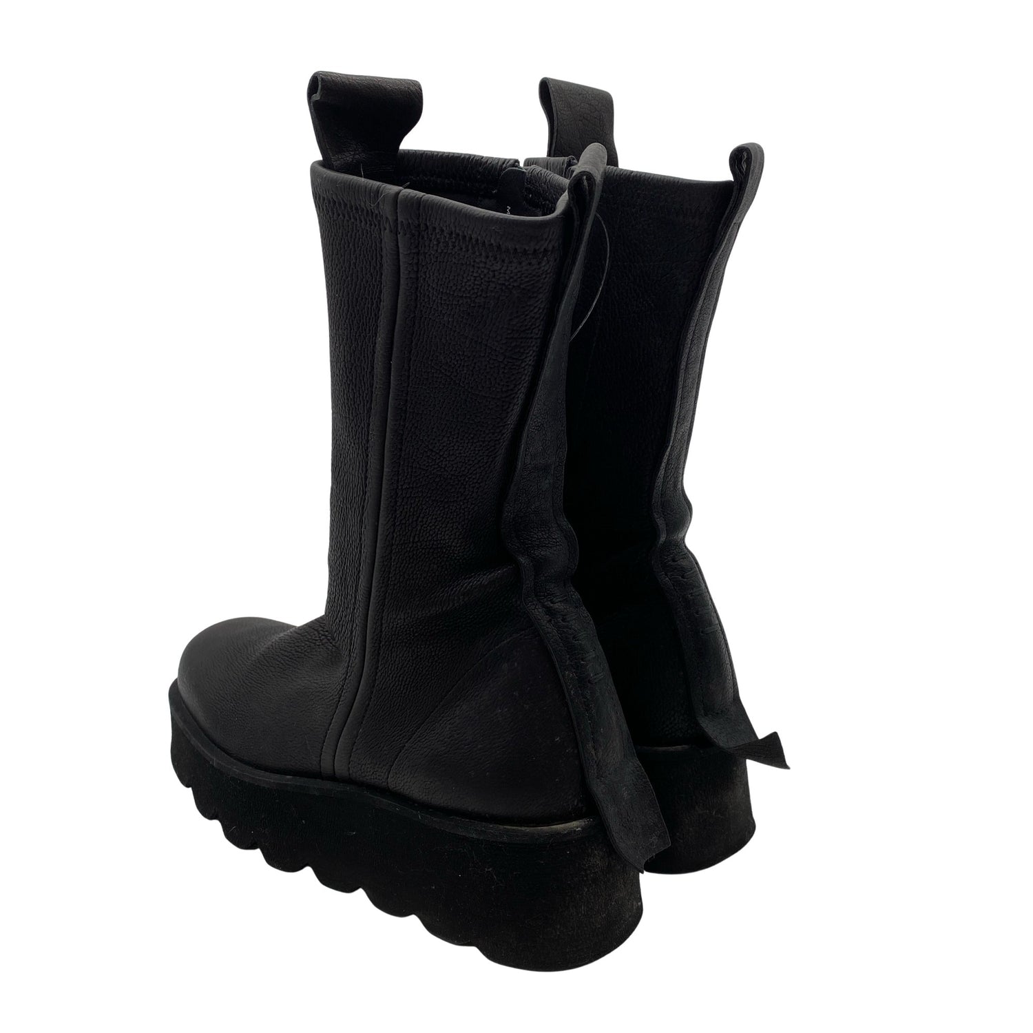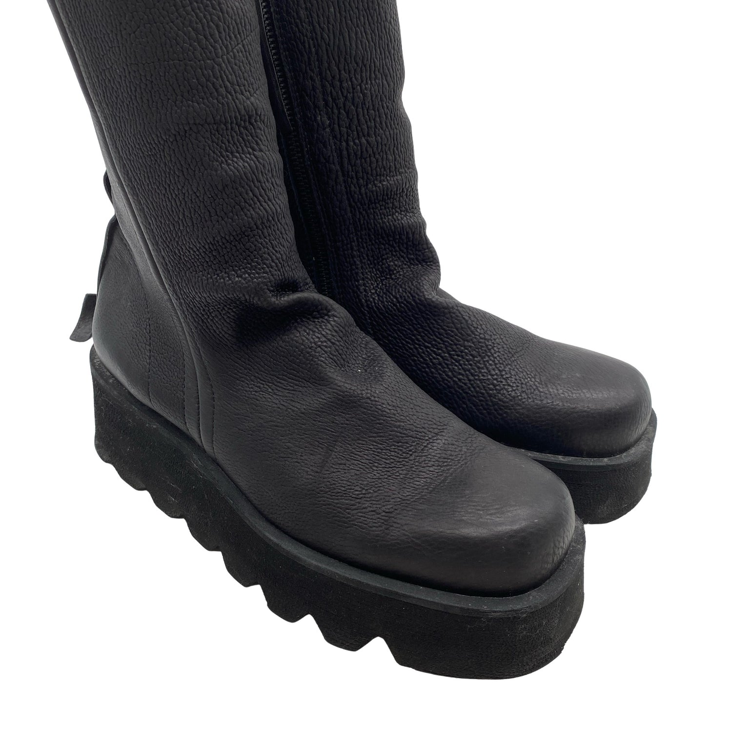 Materiaalitieto puuttuu. Todennäköisesti nahkaa. Paksut pohjat. Sivusaumoissa on vetoketjut. Tuotteen pinnassa on hieman käyttölikaa. Lähtee todennäköisesti pesussa. Tuote on muilta osin hyvässä kunnossa.