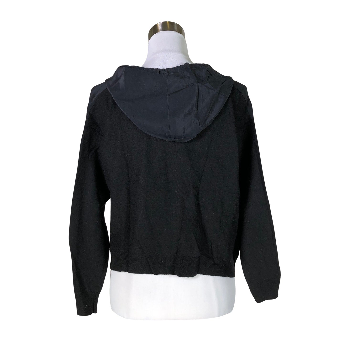 Silkkiä. Villaa. Tuotteen etu- ja takakappale ovat eri materiaalia. Tuote on osin neulosta. Tuotteen pinnassa on hieman pesu-/käyttökulumaa. Yleisilme on siisti.