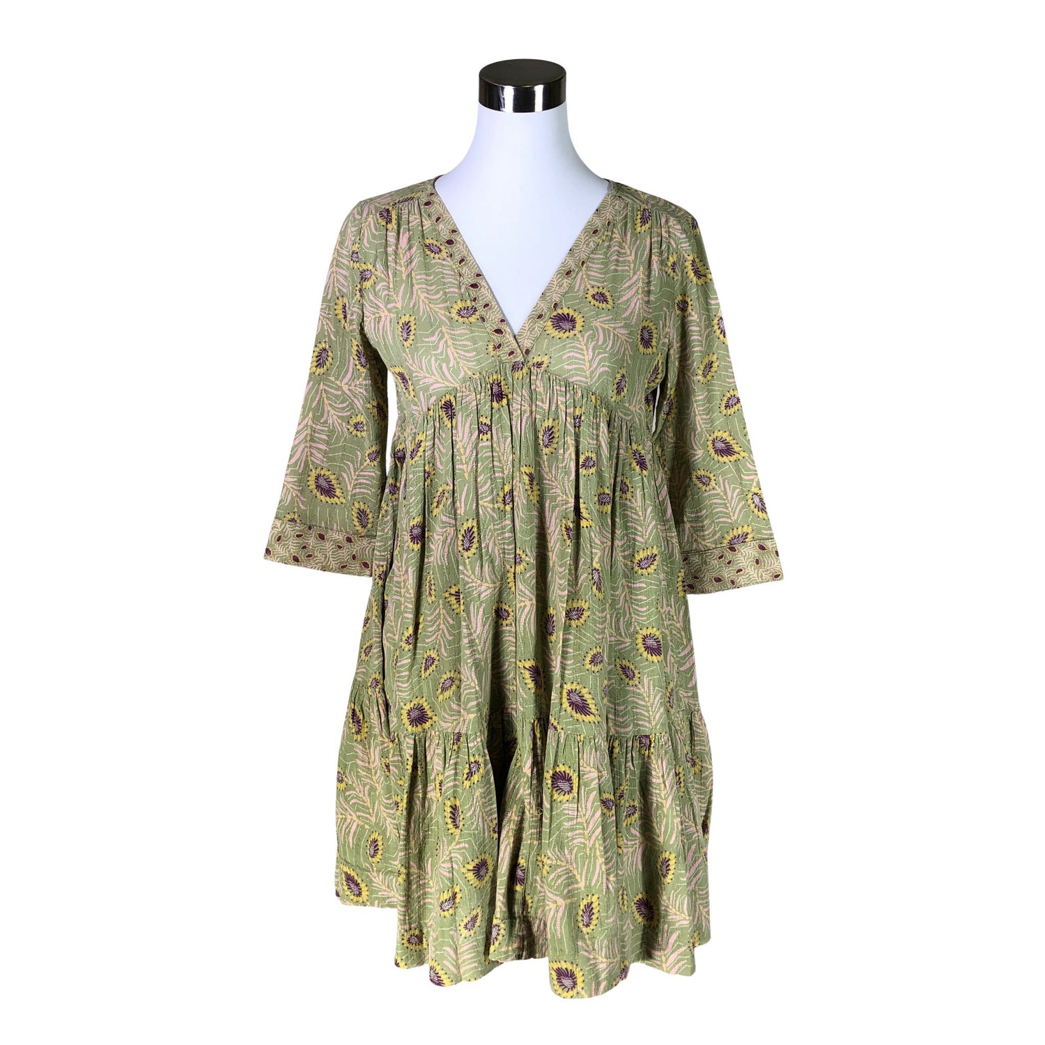 Materiaali ei jousta. Langassa on kiiltoa. Tuotteessa on ohut vuori. Vajaamittaiset hihat. Tuotteen pinnassa on aavistus pesu-/käyttökulumaa. Tuote on muilta osin hyvässä kunnossa.