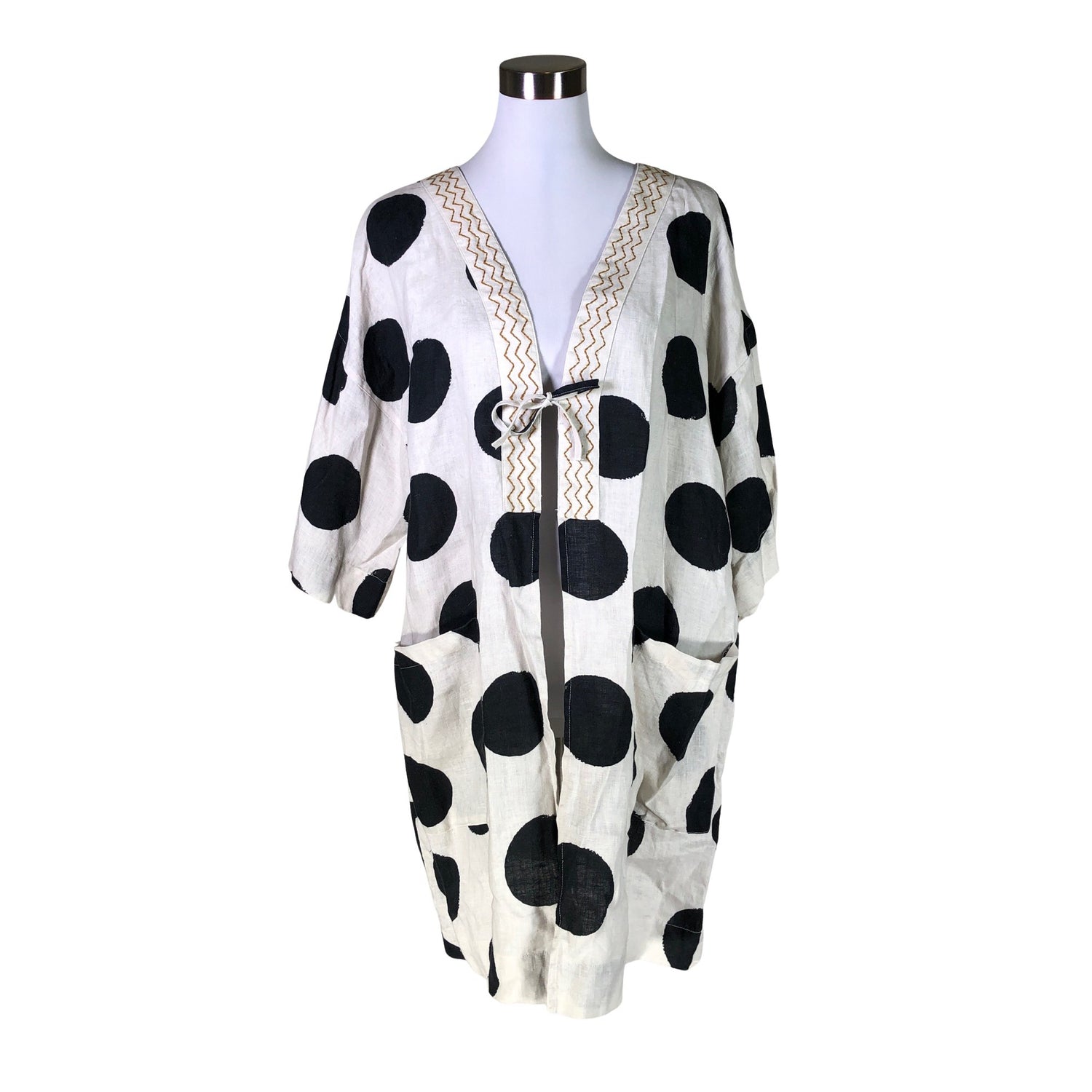 Vaatteessa on taskut. Solmittava malli. Materiaali ei jousta. Tuotteen pinnassa on hieman pesu-/käyttökulumaa. Yleisilme on siisti.