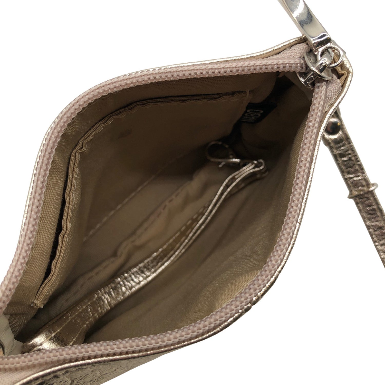 Crossbody. Irrotettava olkahihna/rannelenkki. Olkahihnan pituus on säädettävissä. Tuotteen sisäpuolella on tahra. Tuotteen pinnassa on aavistus pesu-/käyttökulumaa.
