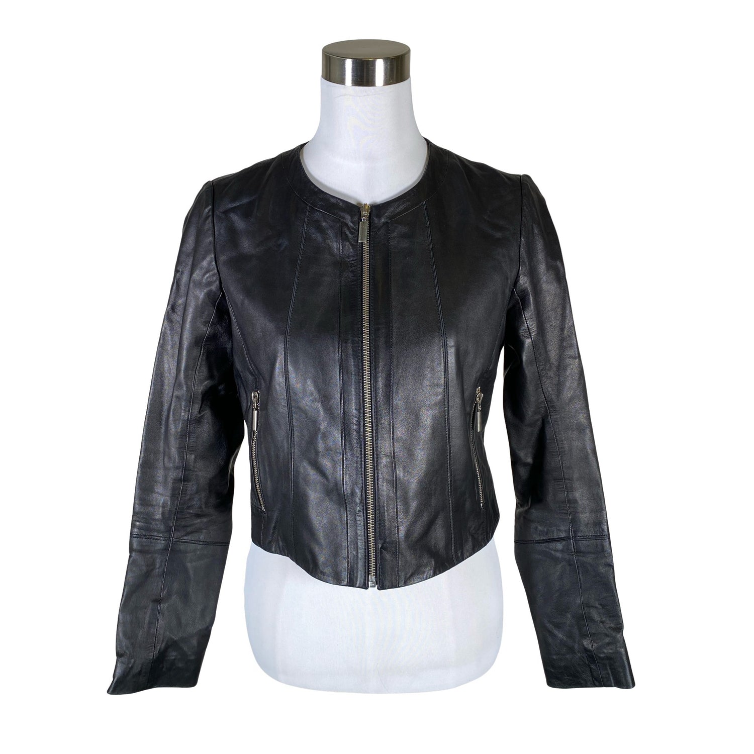 Nahkaa. Tuotteessa on ohut vuori. Tuotteen taskuissa on vetoketjut.