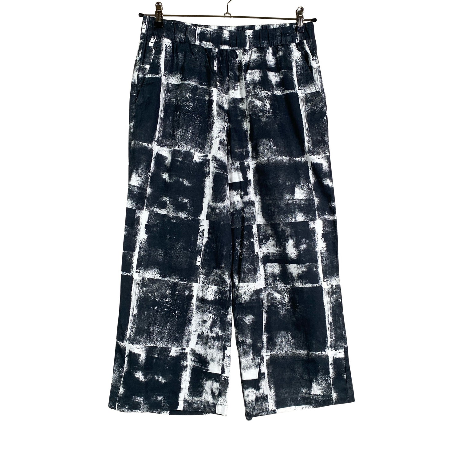 Joustava vyötärö. Vajaamittaiset lahkeet. Tuotteen pinnassa on aavistus pesu-/käyttökulumaa. Yleisilme on siisti.