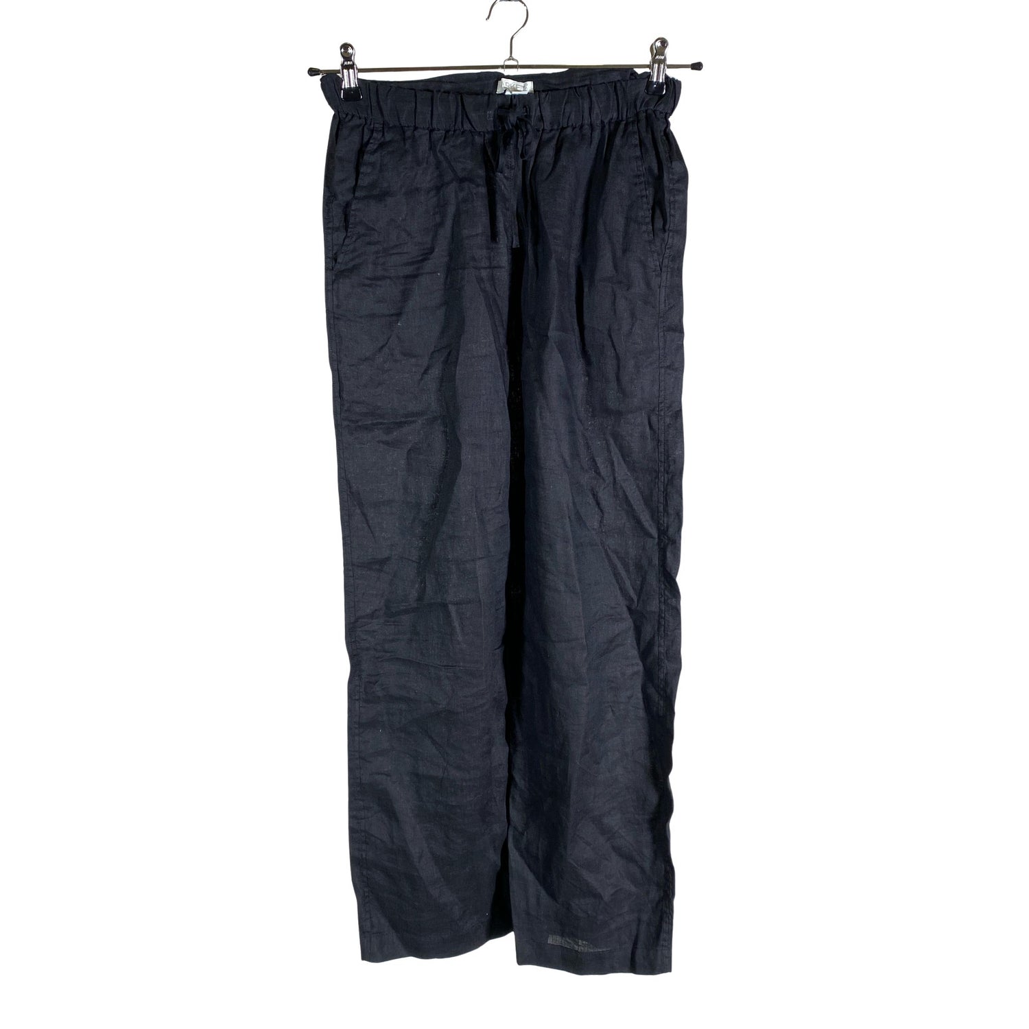 Joustava vyötärö. Kiristysnauha vyötäröllä. Pellavaa. Läpikuultavaa materiaalia. Tuotteen pinnassa on muutama haalea tahra. Lähtee todennäköisesti pesussa. Tuote on muilta osin hyvässä kunnossa.