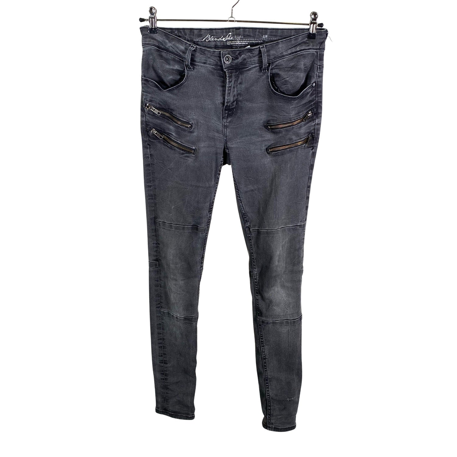 Malli: slim, regular. Materiaali joustaa hieman. Kulutettu kuosi. Tuotteen pinnassa on hieman pesu-/käyttökulumaa. Yleisilme on siisti.