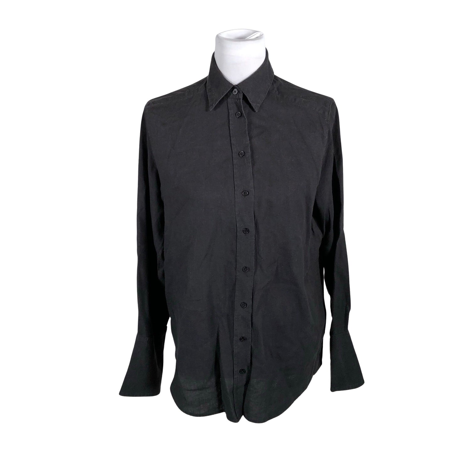 Pellavasekoitetta. Materiaali ei jousta. Edessä napit. Tuotteen pinnassa on aavistus pesu-/käyttökulumaa. Yleisilme on siisti.