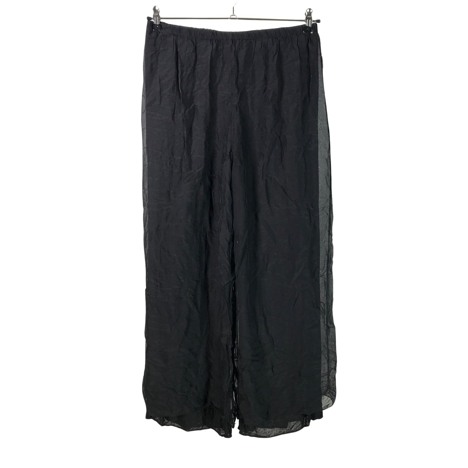 Joustava vyötärö. Läpikuultavaa materiaalia. Trikoovuori. Tuotteen pinnassa on hieman pesu-/käyttökulumaa. Yleisilme on siisti.