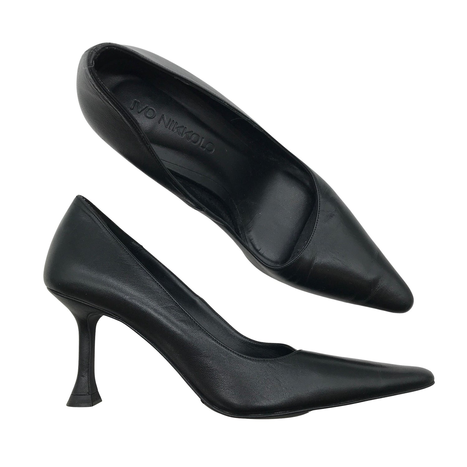 Nahkaa. Korkeat korot (yli 8 cm). Tuotteen pinnassa on aavistus pesu-/käyttökulumaa. Yleisilme on siisti.
