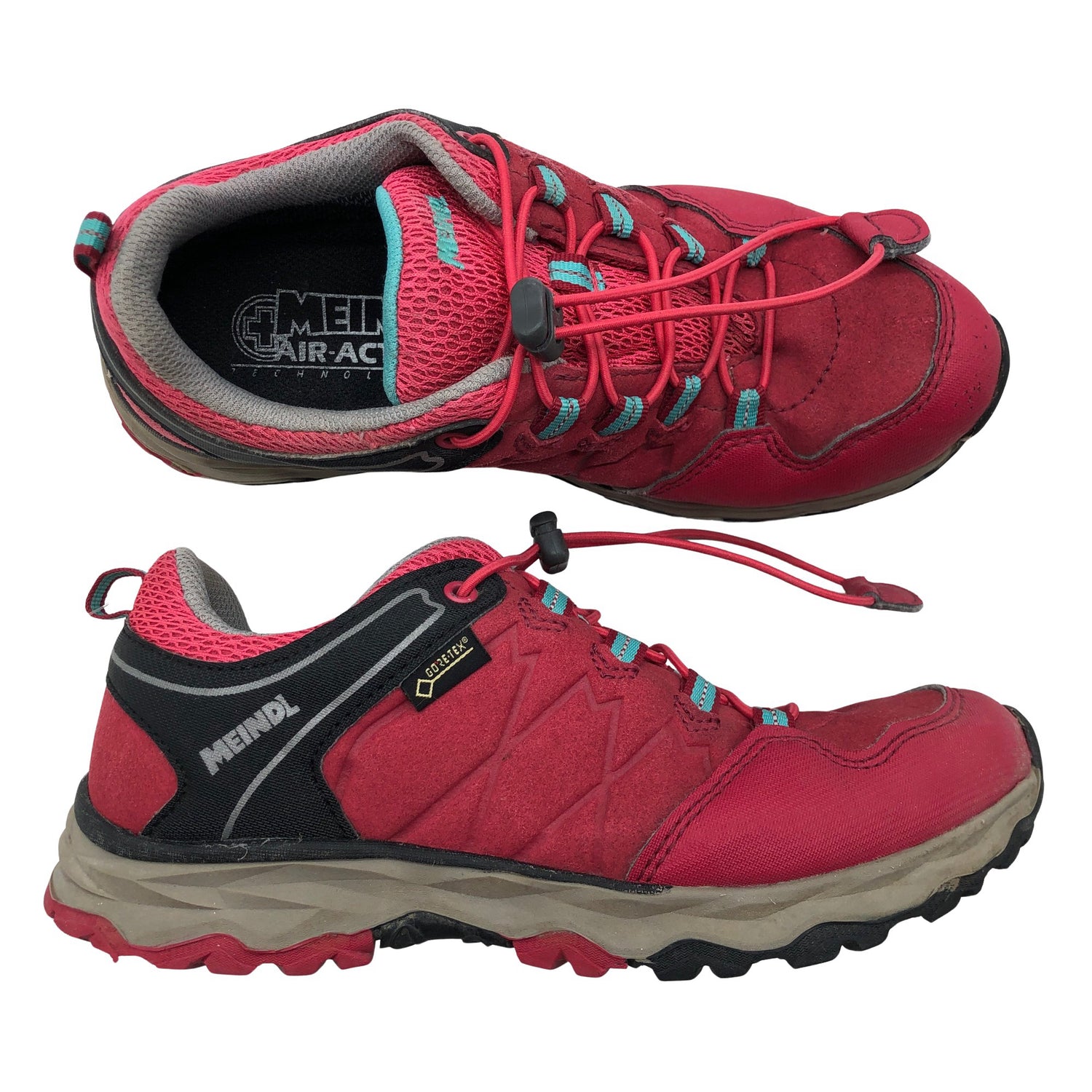 Gore-Tex -merkintä. Tuotteen pinnassa on aavistus käyttölikaa. Kenkien kärjissä on kulumaa. Tuotteen pinnassa on aavistus pesu-/käyttökulumaa. Yleisilme on siisti.