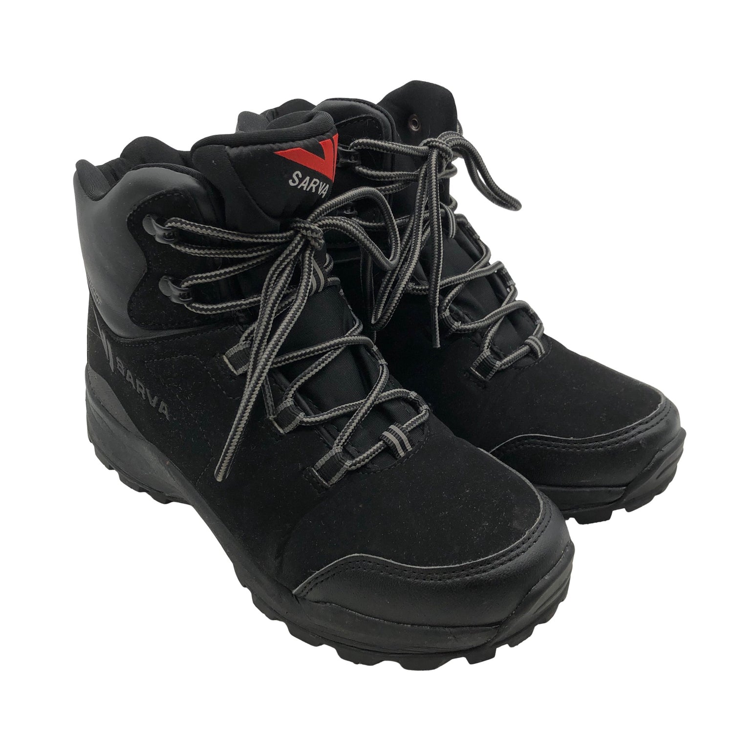 Sarva Talvikengät, koko 37. Kenkien pohjissa on nastat. Tuotteessa on vetoketju. Irtokarvoja sisäpuolella. Kenkien kärjissä on aavistus kulumaa. Kenkien pohjissa on aavistus kulumaa. Tuotteen pinnassa on aavistus pesu-/käyttökulumaa. Yleisilme on siisti.