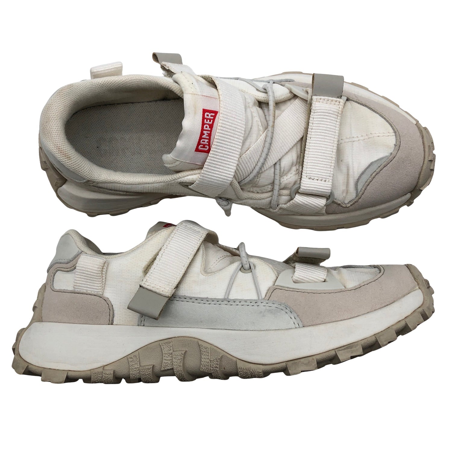 Camper Lenkkarit, koko 39. Tuotteessa on tarrakiinnitys. Paksut pohjat. Tuotteen pinnassa on aavistus tummentumaa. Tuotteen pinnassa on hieman pesu-/käyttökulumaa. Yleisilme on siisti.