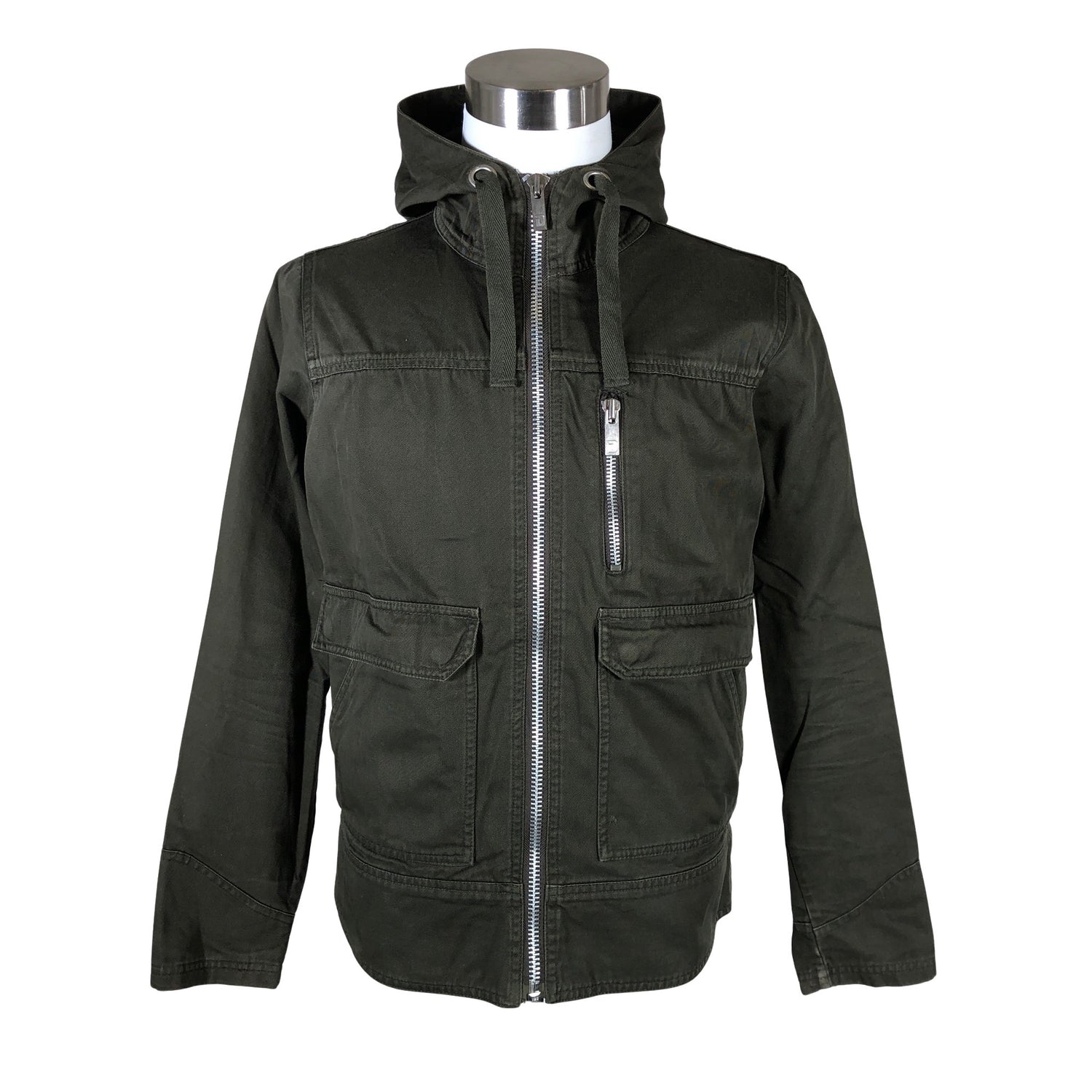 Parkatakki. Tuotteessa ei ole vuorta. Kulutettu kuosi. Tuotteessa on huppu. Tuotteen pinnassa on aavistus pesu-/käyttökulumaa. Yleisilme on siisti.