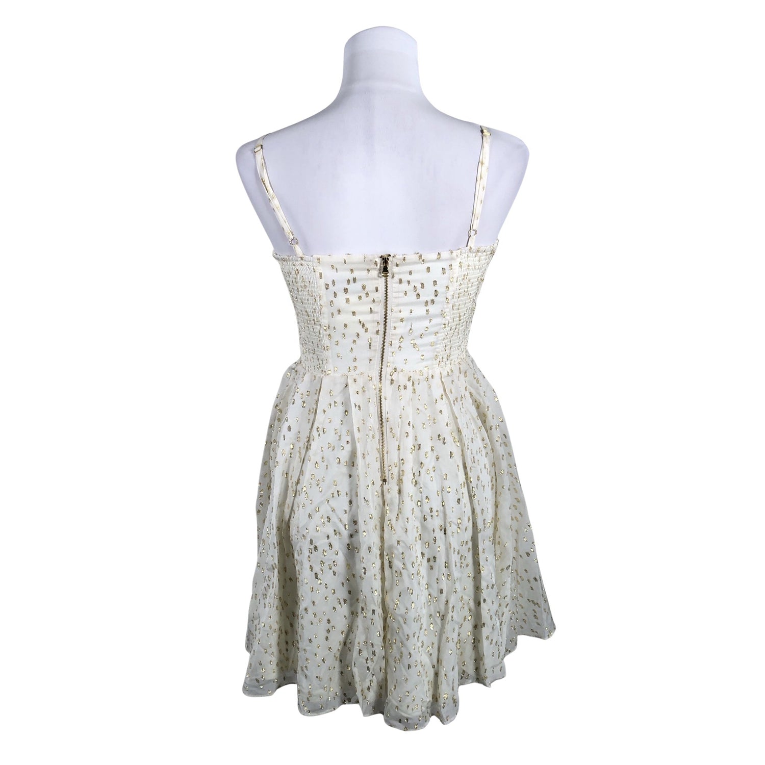 Säädettävät olkaimet. Kevyesti topattu. Tuotteessa on joustava kuminauharypytys. Vetoketju takana. Tuotteen pinnassa on kimalletta. Väri: kulta. Kauluksen sisäpuolella on hieman tummentumaa. Tuote on muilta osin hyvässä kunnossa.