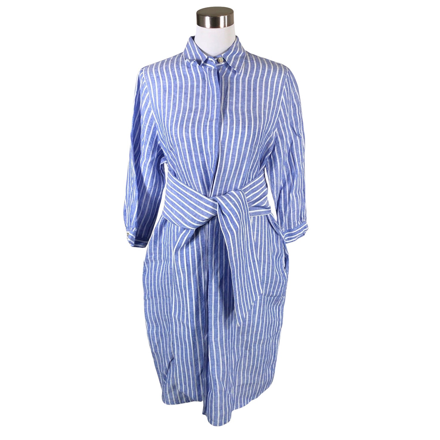 Pellavaa. Materiaali ei jousta. Tuotteeseen kuuluu vyö. Vaatteessa on taskut.