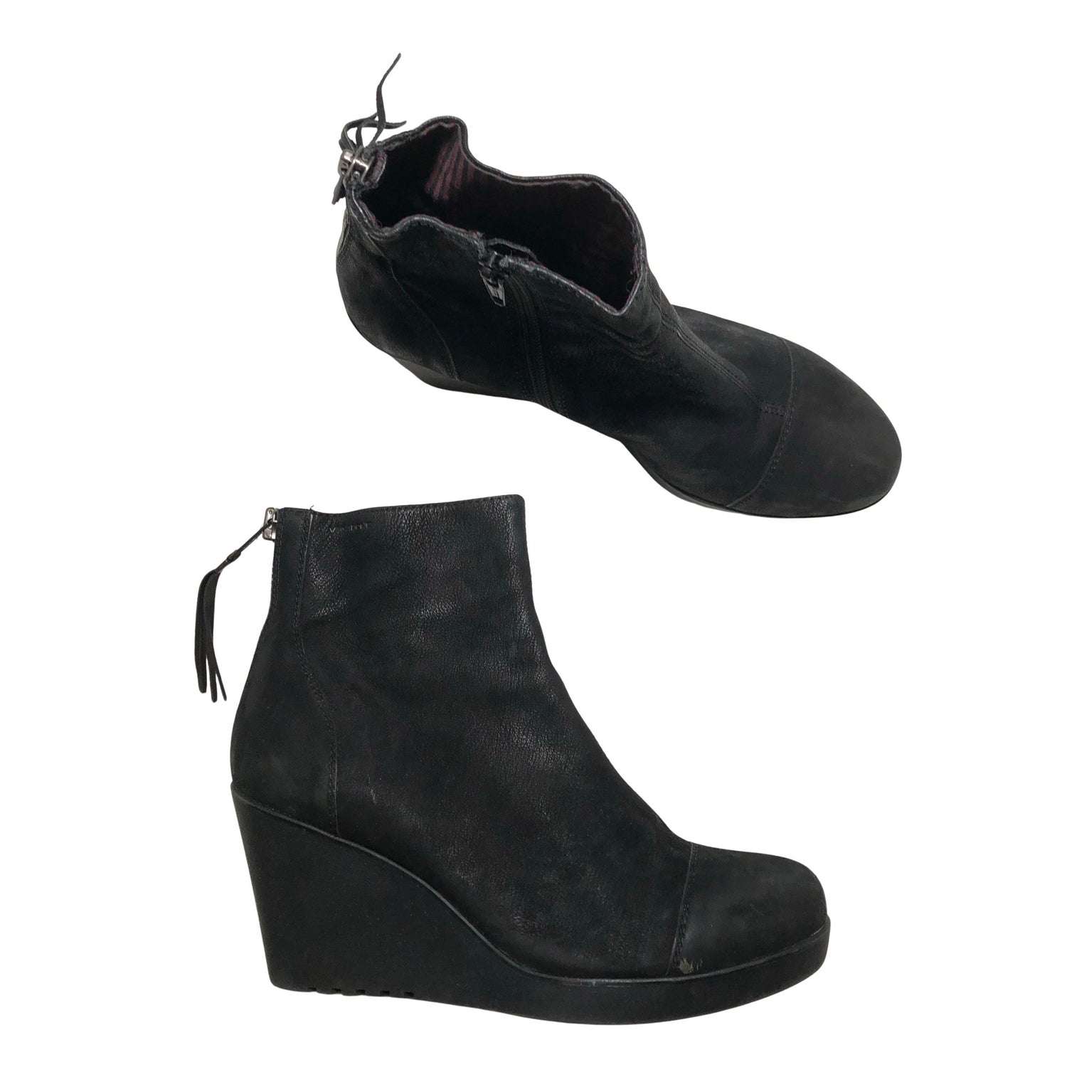 Nahkaa. Tuotteessa on vetoketju. Kenkien kärjissä on hieman kulumaa. Tuotteen pinnassa on aavistus pesu-/käyttökulumaa. Yleisilme on siisti.