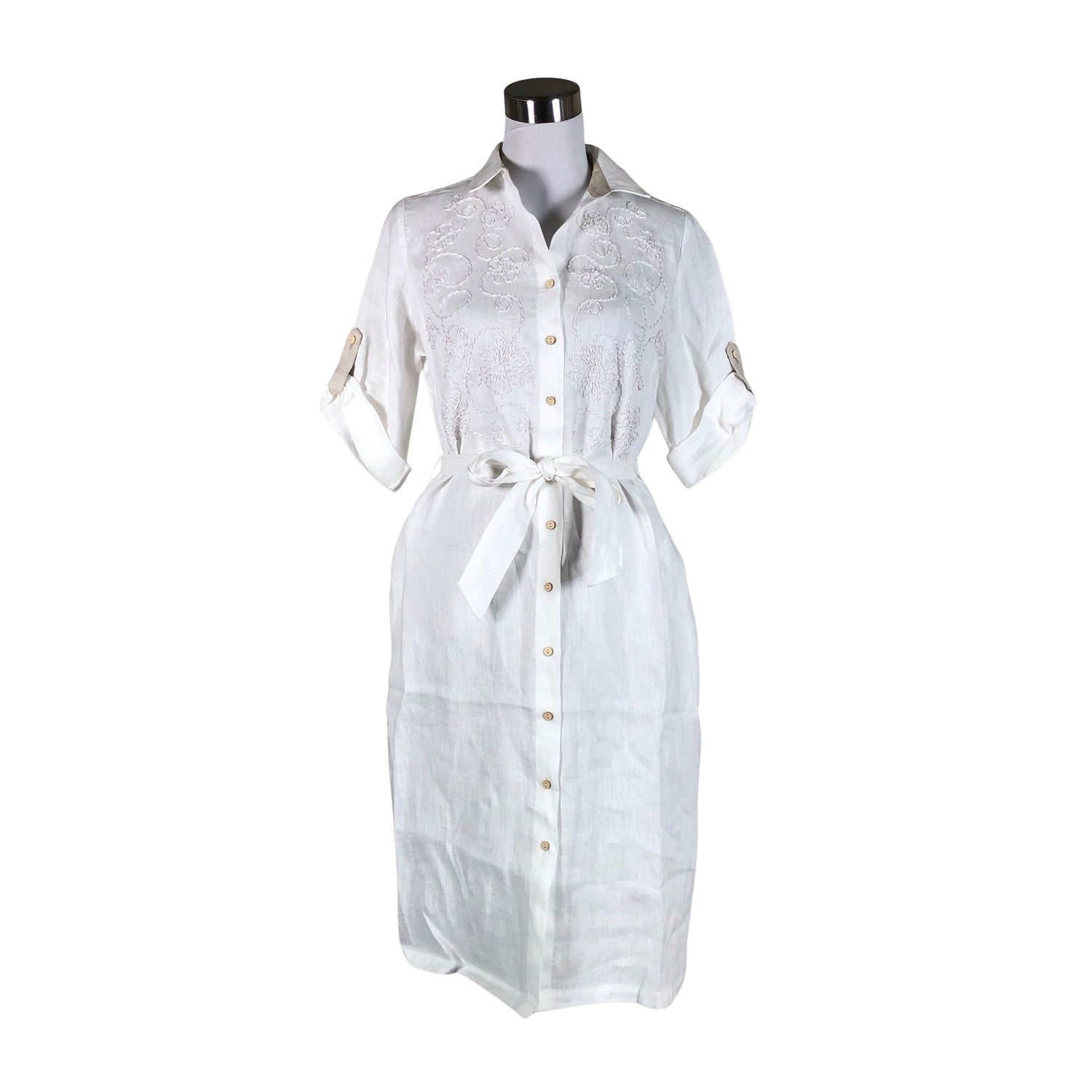 Pellavaa. Kirjailtu. Vaatteessa on taskut.
