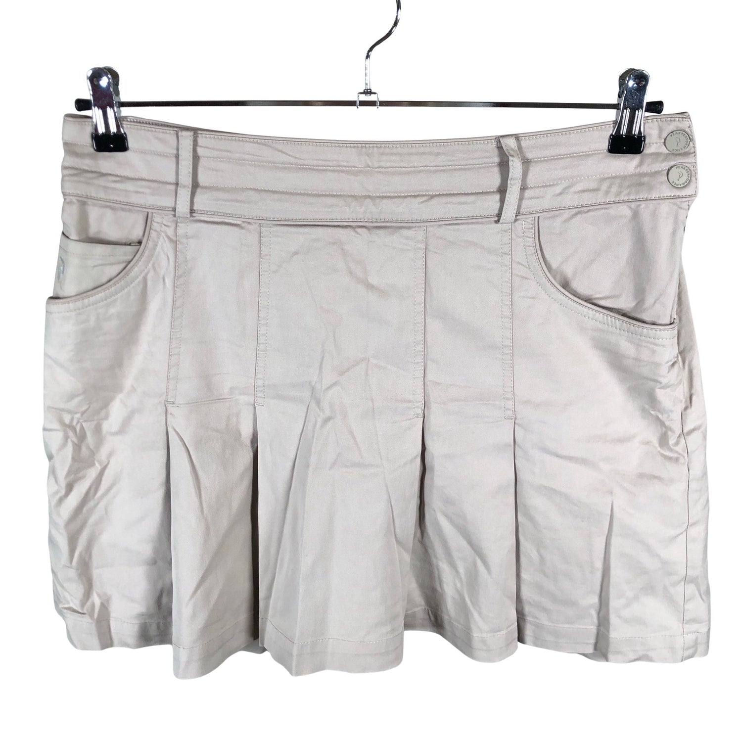 Hameessa on shortsit alla. Vaatteessa on taskut.