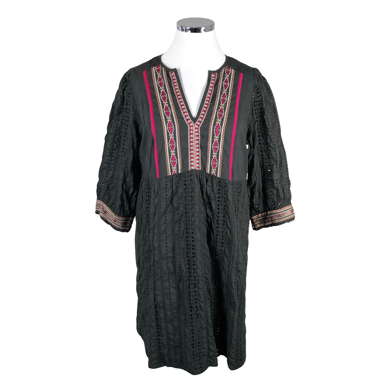 Tuote on osin pitsiä. Kirjailtu. Tuotteessa on ohut vuori. Materiaali ei jousta. Tuotteen pinnassa on hieman pesu-/käyttökulumaa. Yleisilme on siisti.