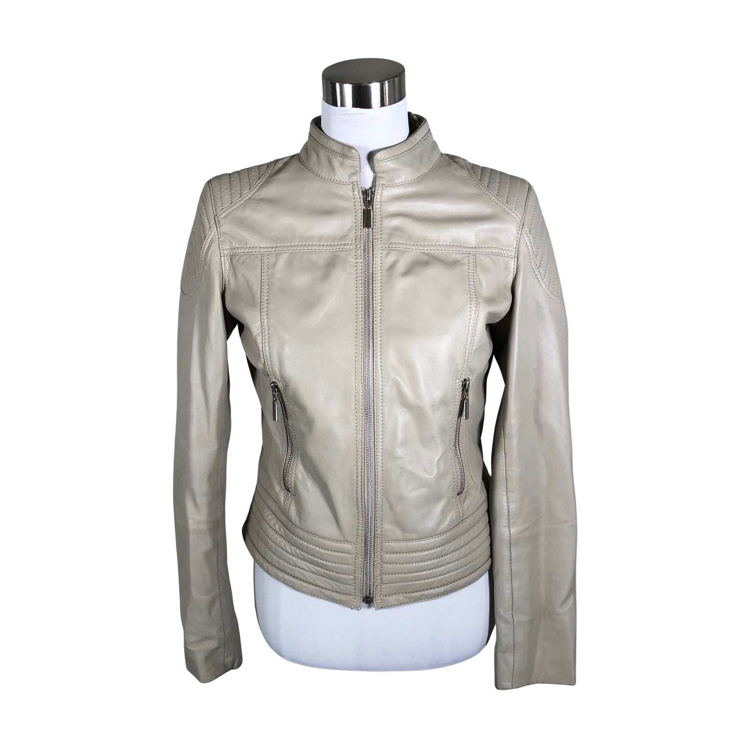 Biker. Pehmeää nahkaa. Hihan- ja/tai lahkeensuissa on aavistus kulumaa. Tuotteen pinnassa on pieni tahra.