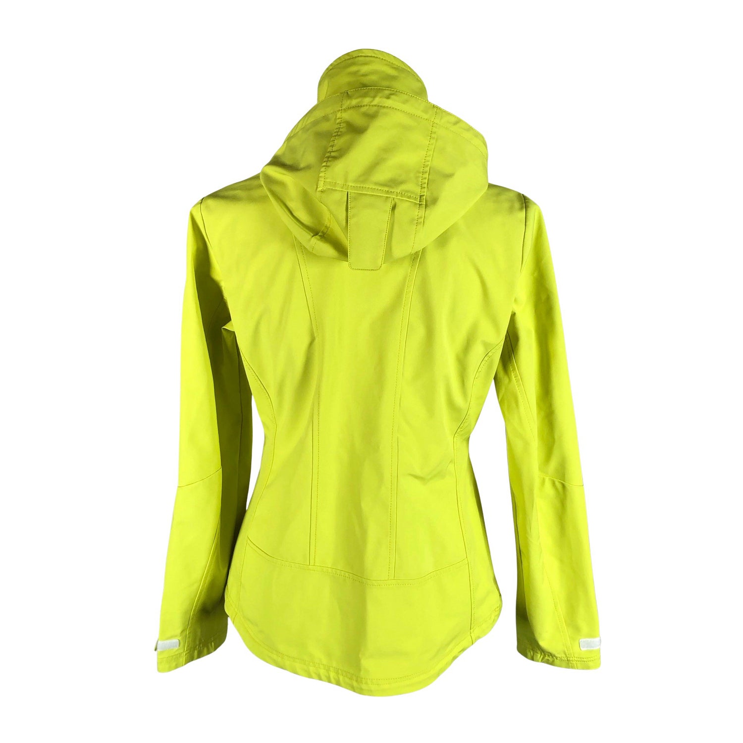 Kirkas väri. Irrotettava huppu. Tuotteen taskuissa on vetoketjut. Tuotteessa ei ole vuorta. Tuotteen pinnassa on aavistus tummentumaa. Tuotteen sisäpuolella on aavistus nukkaa. Yleisilme on siisti.
