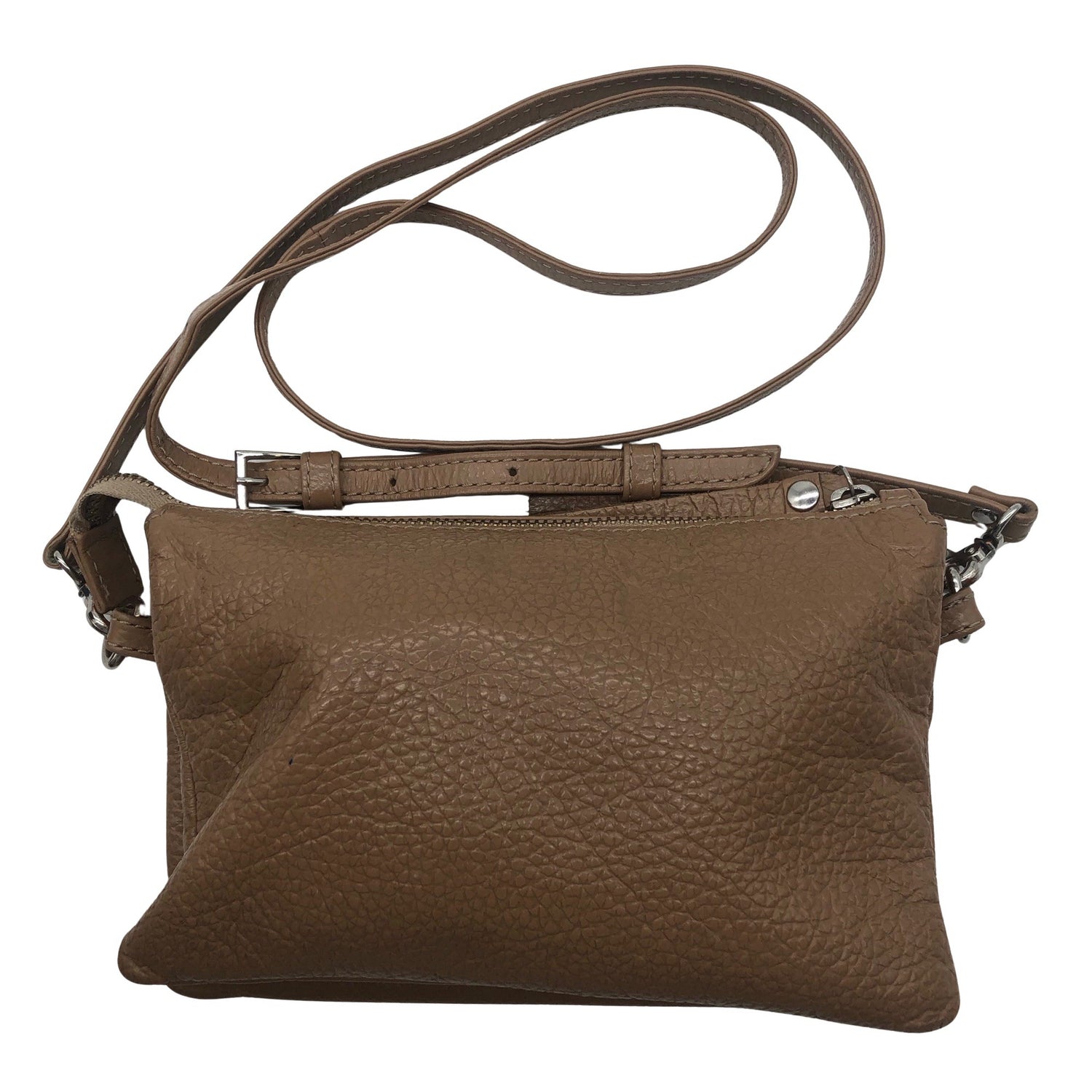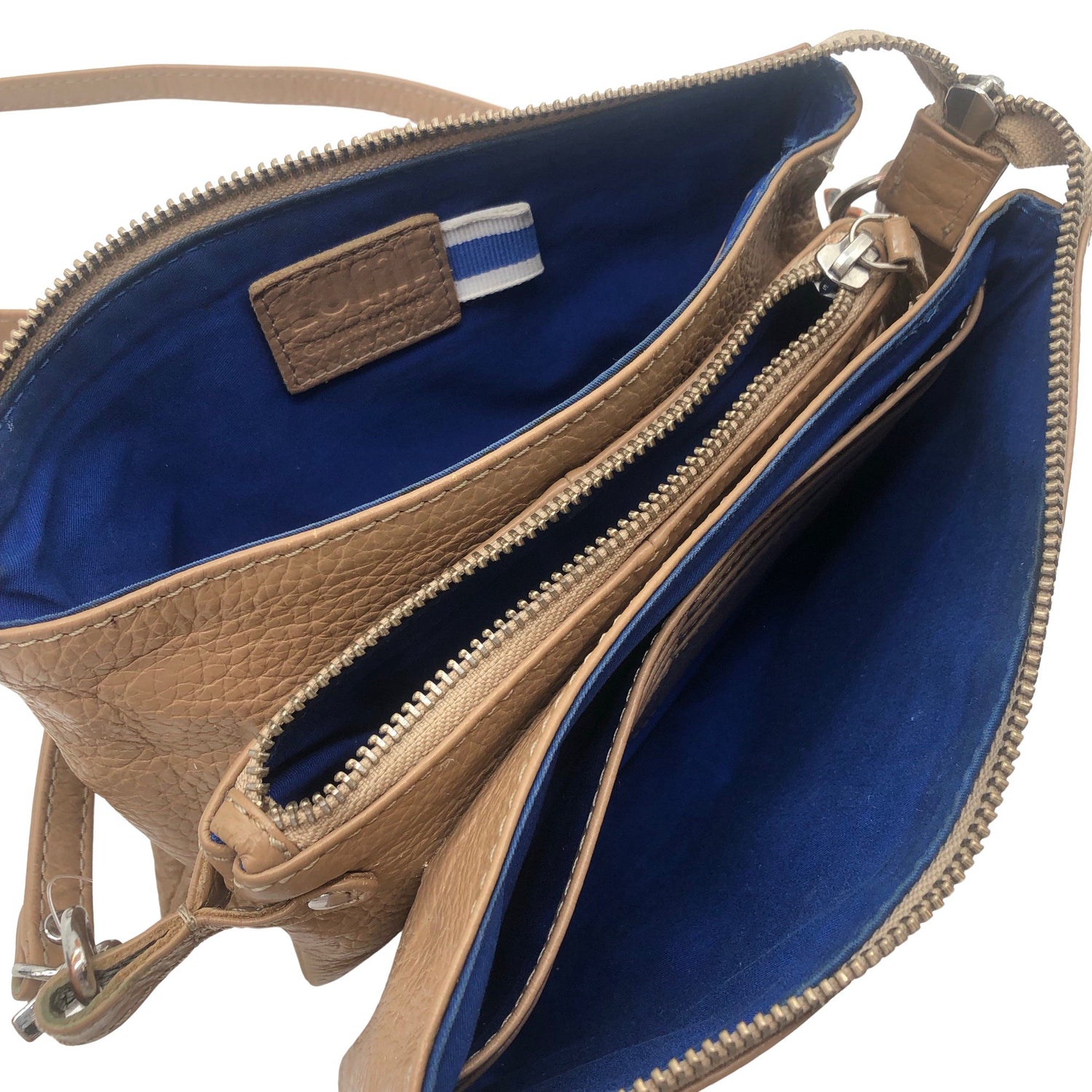 Crossbody. Materiaalitieto puuttuu. Todennäköisesti nahkaa. Tuotteen sisäpuolella on aavistus käyttölikaa. Yleisilme on siisti.