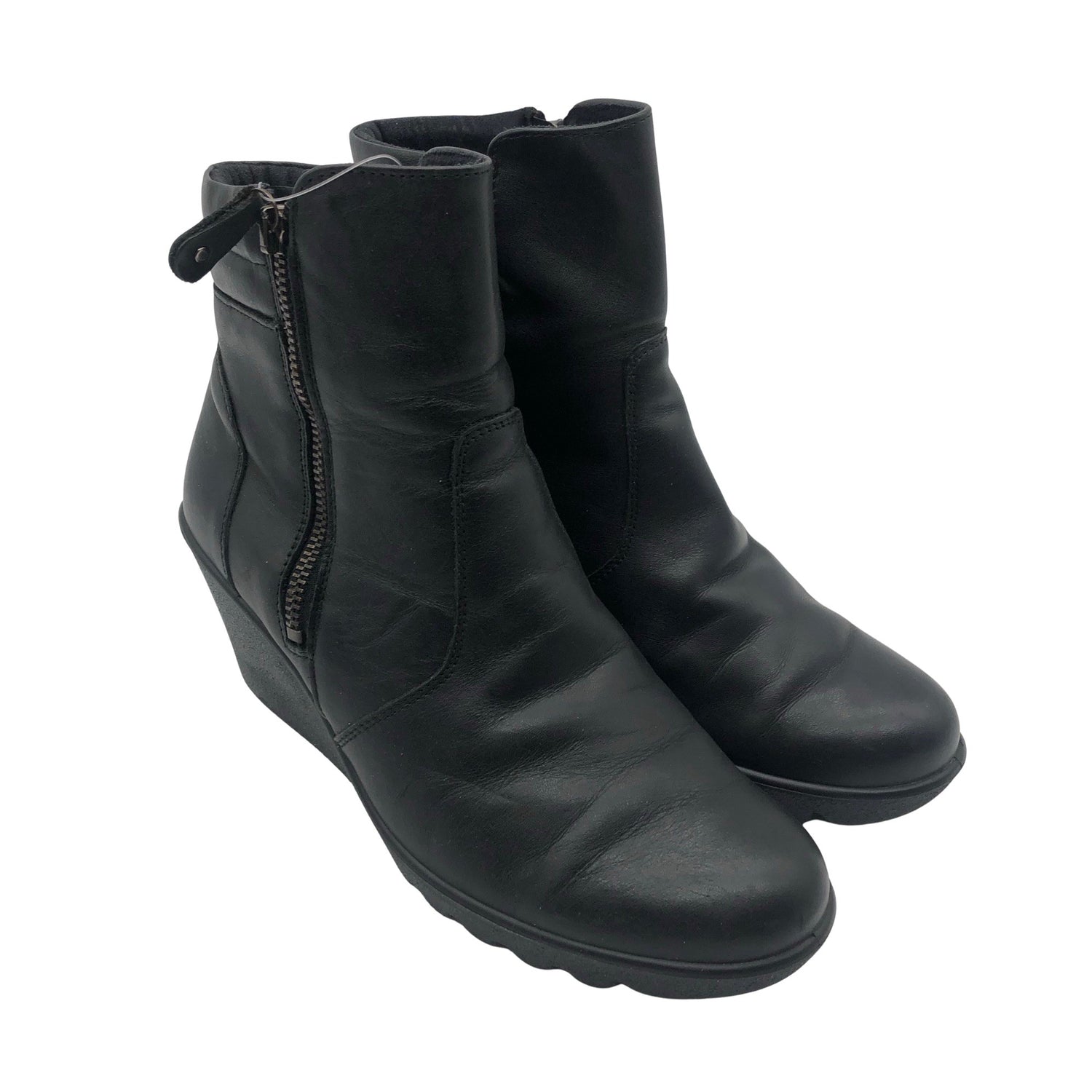 Materiaalitieto puuttuu. Todennäköisesti nahkaa. Sivusaumoissa on vetoketjut. Kiilakorko. Tuotteen pinnassa on aavistus pesu-/käyttökulumaa. Tuote on muilta osin hyvässä kunnossa.