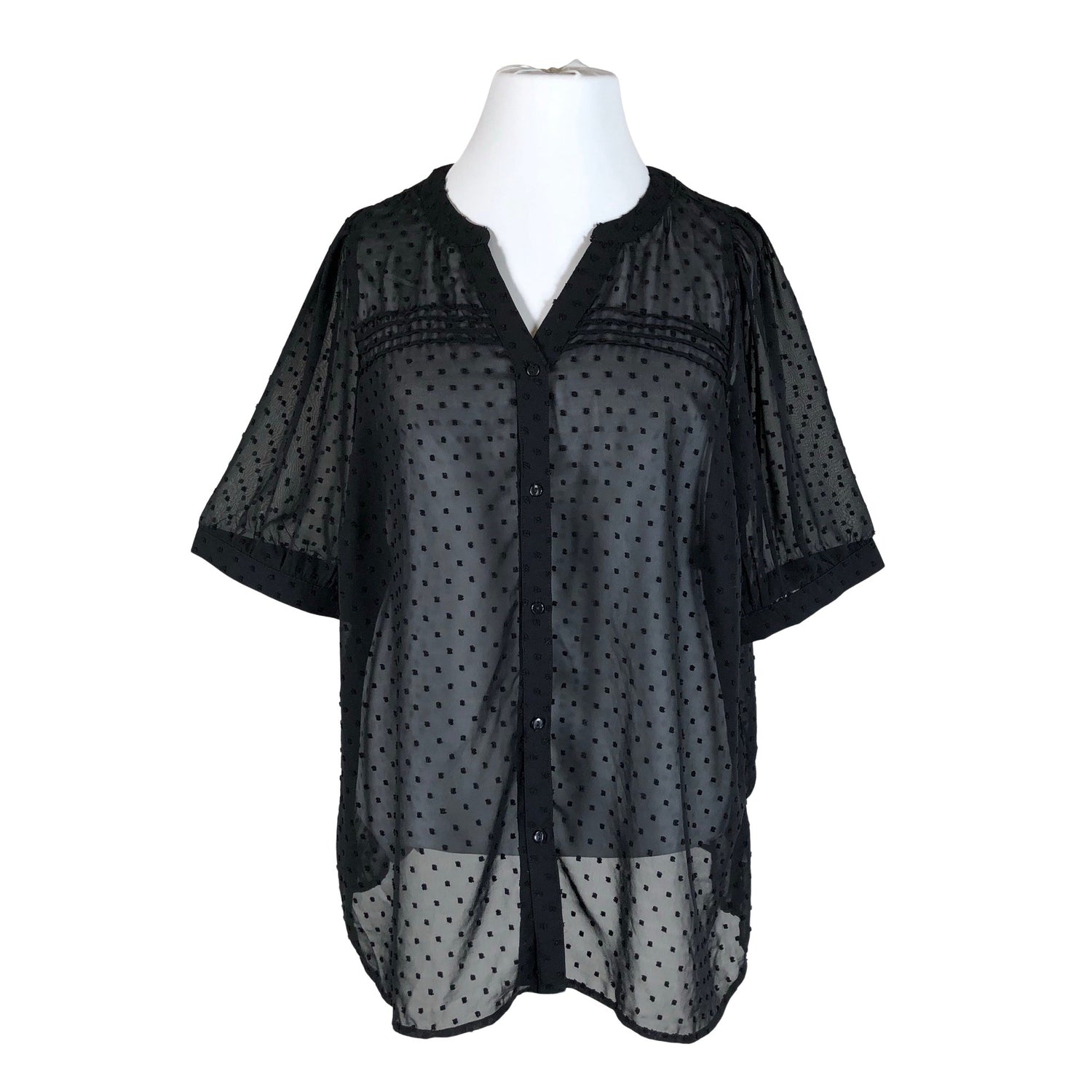 Isot koot-mallistoa. Edessä napit. Läpikuultavaa materiaalia. Materiaali ei jousta. Tuotteen pinnassa on aavistus pesu-/käyttökulumaa. Yleisilme on siisti.