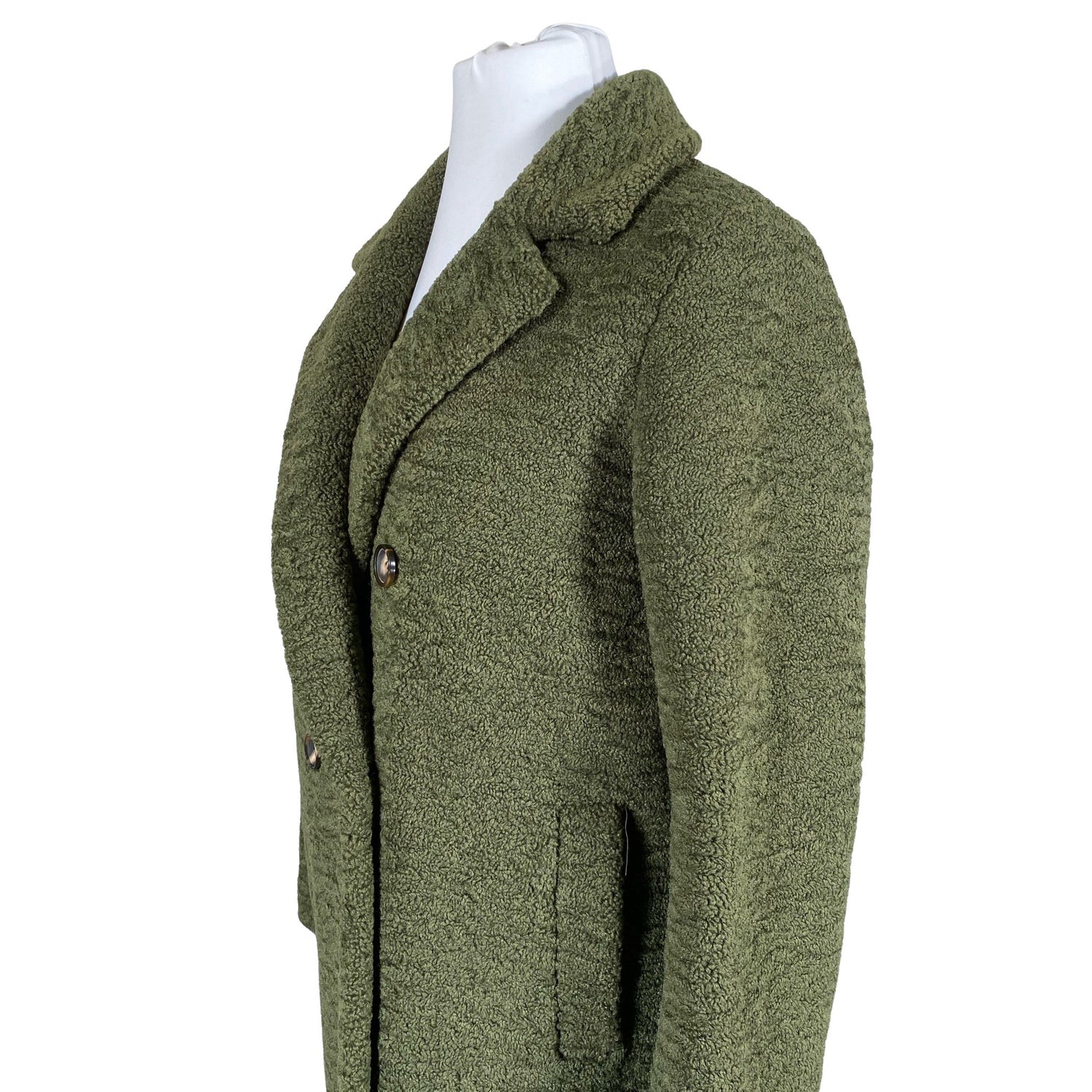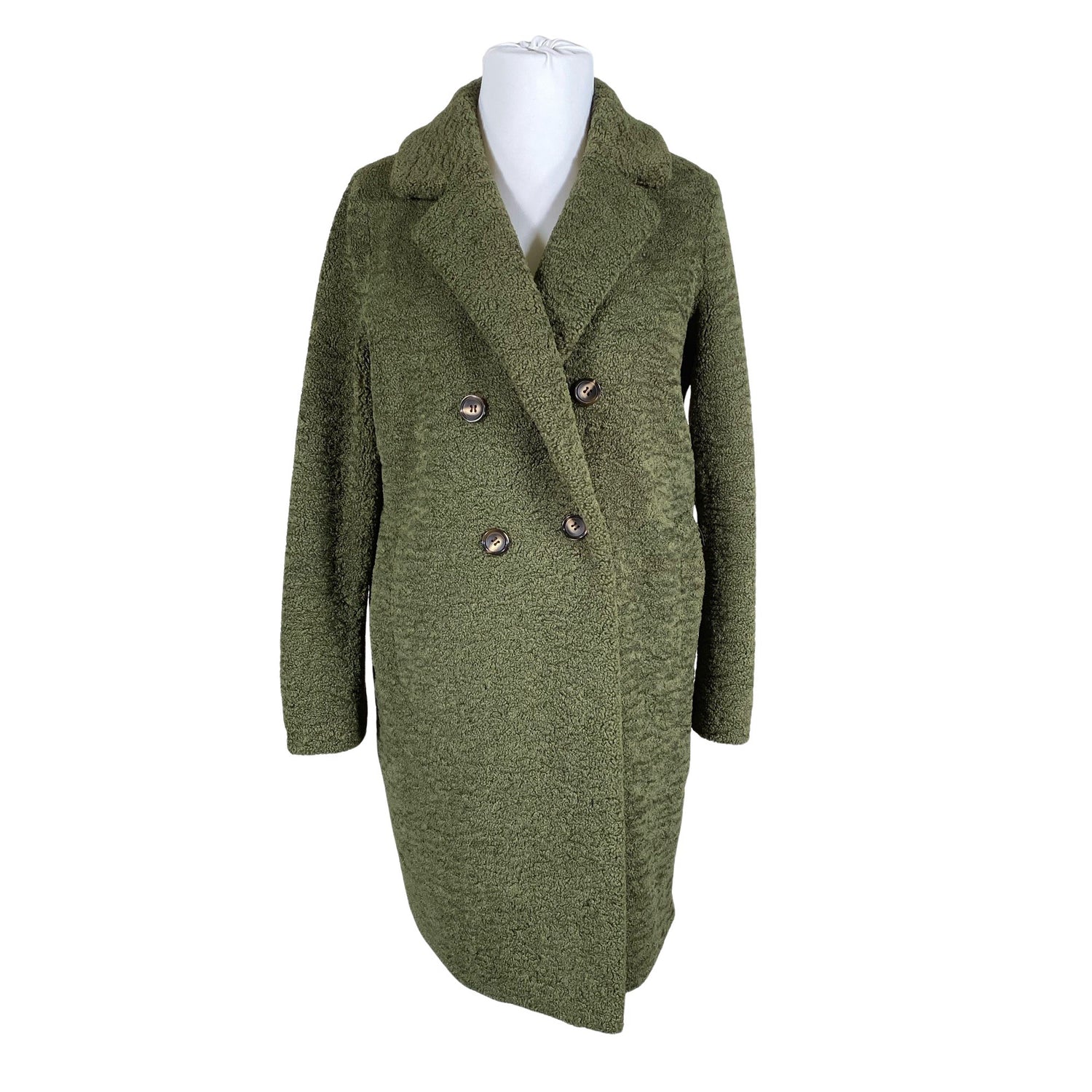 Teddykarvaa. Tuotteessa on ohut vuori. Vaatteessa on taskut. Edessä napit. Paksua materiaalia.