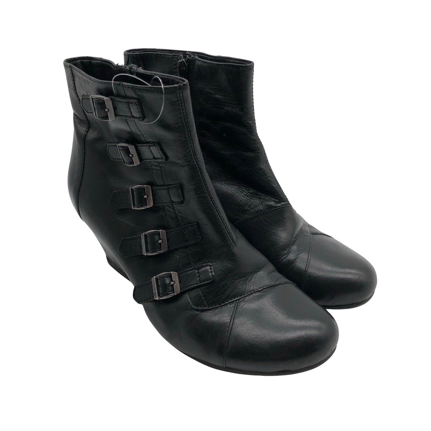 Nahkaa. Kiilakorko. Sivusaumoissa on vetoketjut. Kenkien koroissa on hieman kulumaa. Tuotteen pinnassa on hieman pesu-/käyttökulumaa. Yleisilme on siisti.