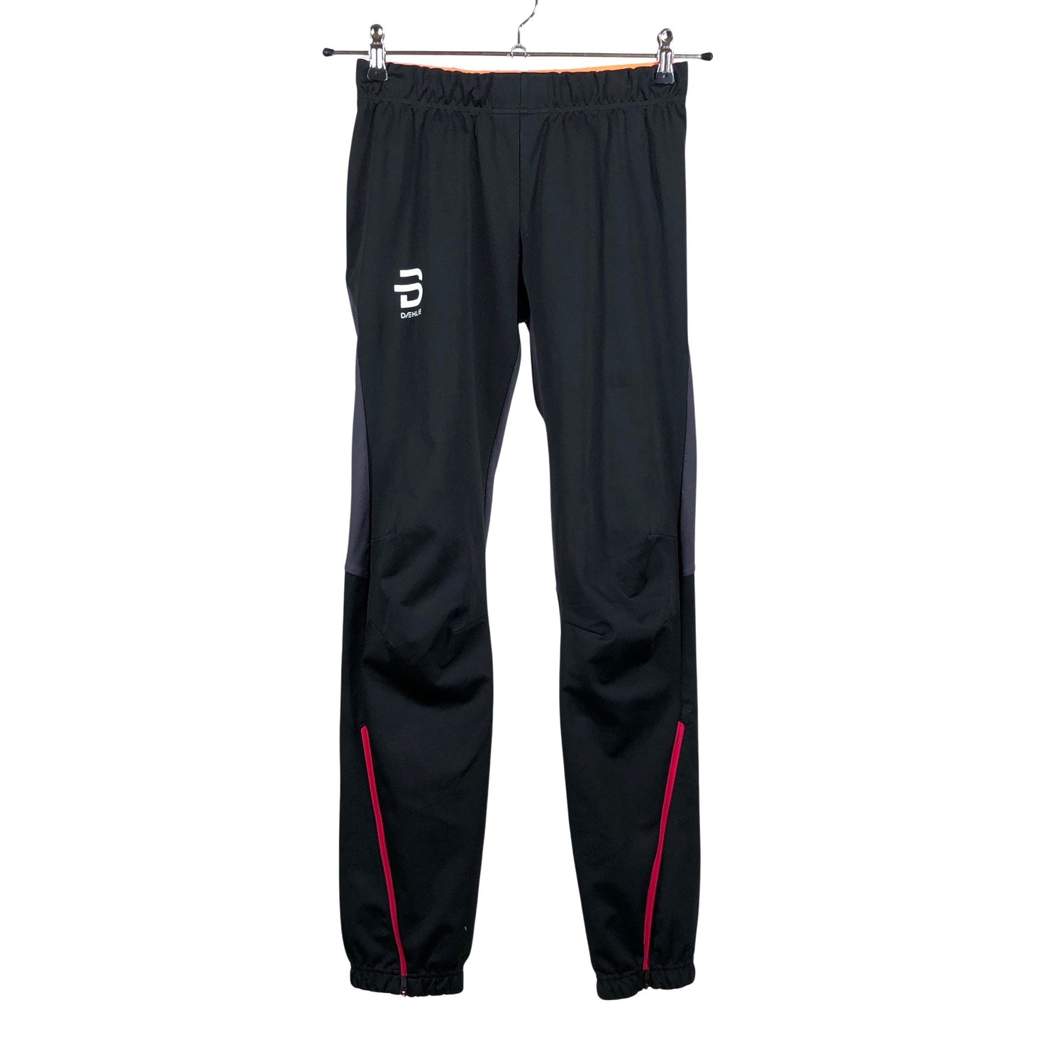 Hiihtohousut. Tuotteen etu- ja takakappale ovat eri materiaalia. Vetoketjut lahkeissa.