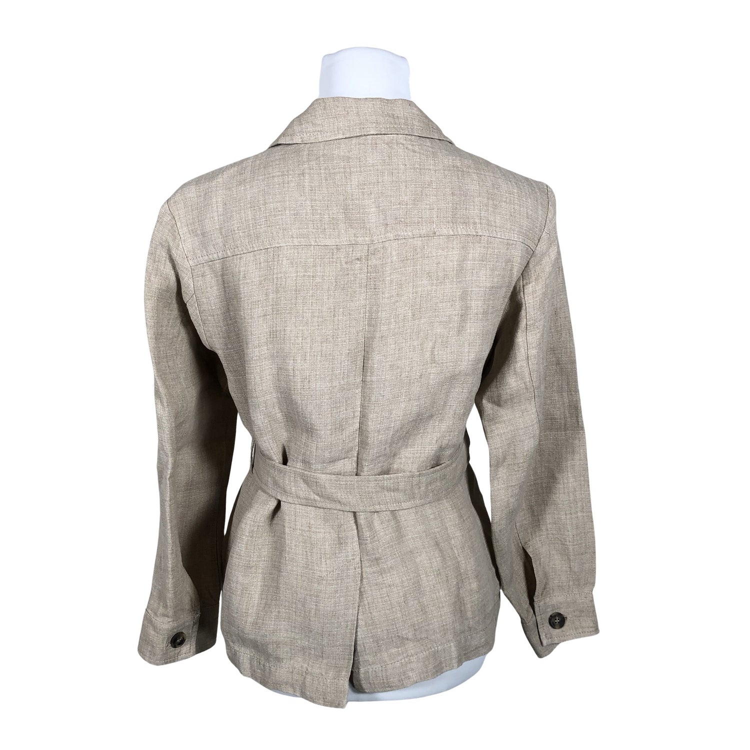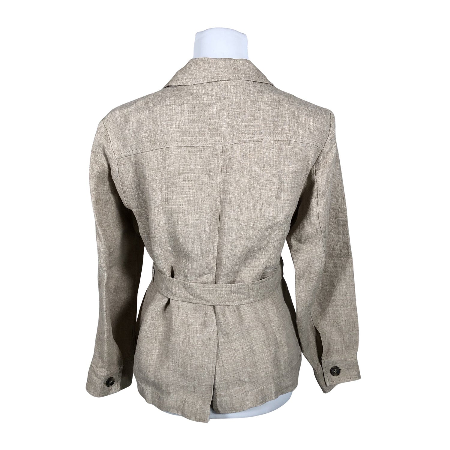 Pellavaa. Tuotteessa ei ole vuorta. Tuotteeseen kuuluu vyö. Tuotteen pinnassa on aavistus pesu-/käyttökulumaa. Yleisilme on siisti.