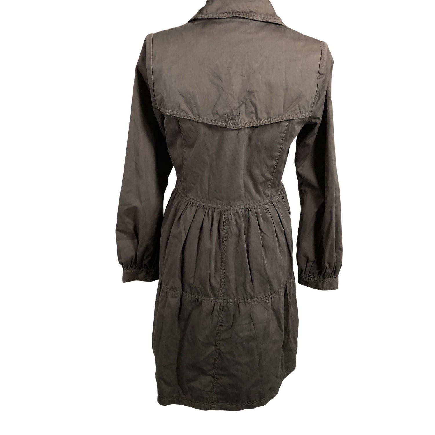 Vaatteessa on taskut. Edessä napit. Tuotteessa on ohut vuori. Tuotteen pinnassa on aavistus pesu-/käyttökulumaa. Tuotteen pinnassa on pieni tahra. Yleisilme on siisti.