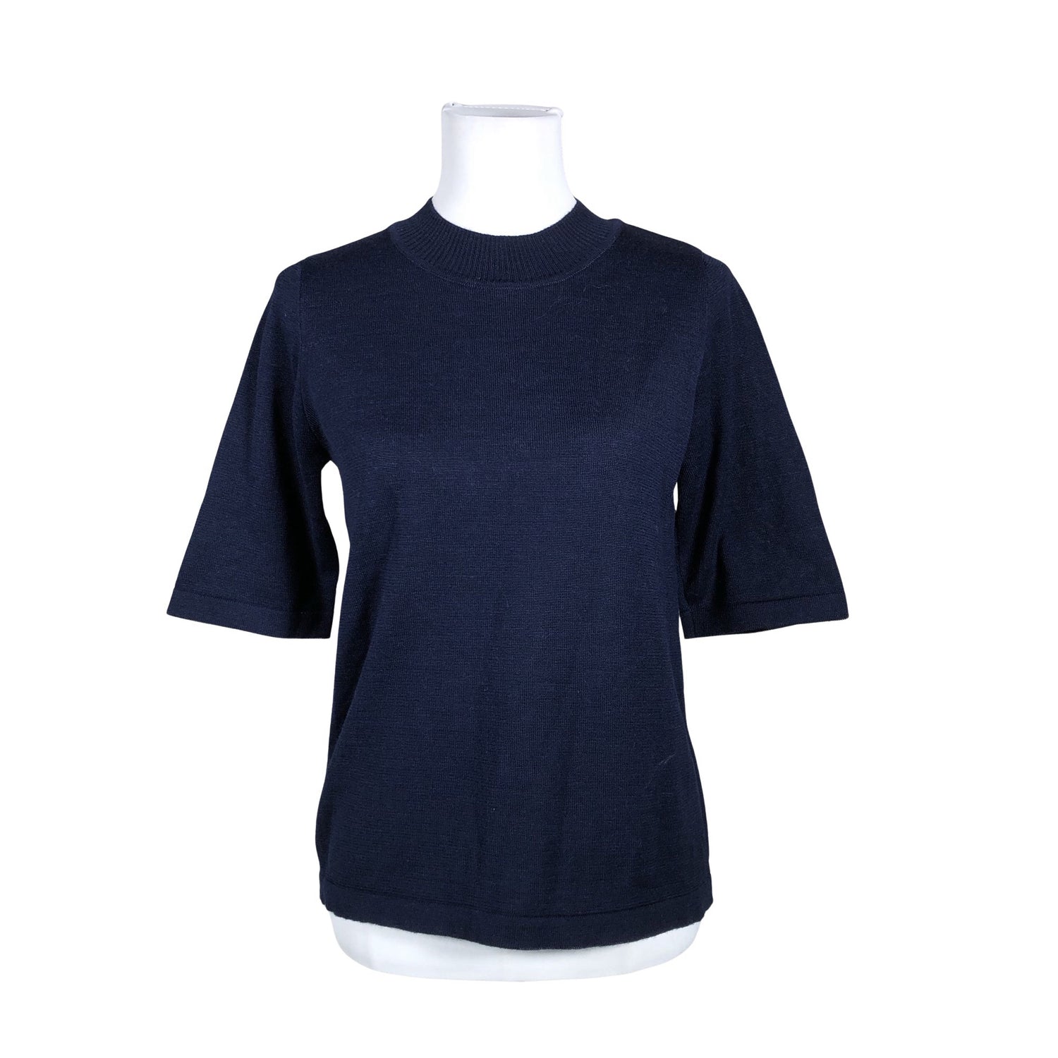 Materiaalitieto puuttuu, todennäköisesti villaa / villasekoitetta. Ohutta neulosta. Tuotteen pinnassa on haalea tahra. Tuote on muilta osin hyvässä kunnossa.