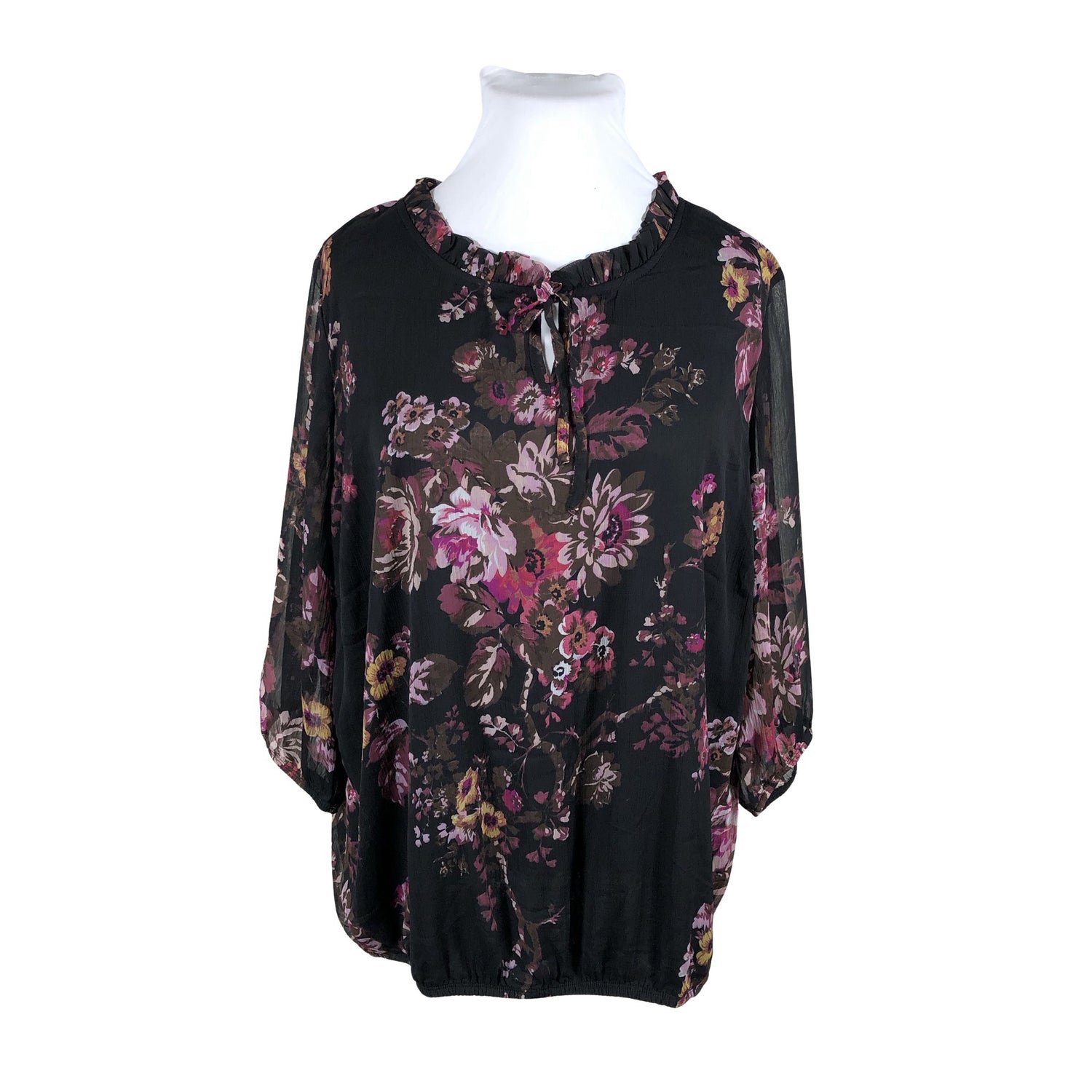 Läpikuultava kangas. Tuote on osittain vuoritettu. Trikoovuori. Vajaamittaiset hihat. Helmassa on kuminauha. Isot koot-mallistoa.